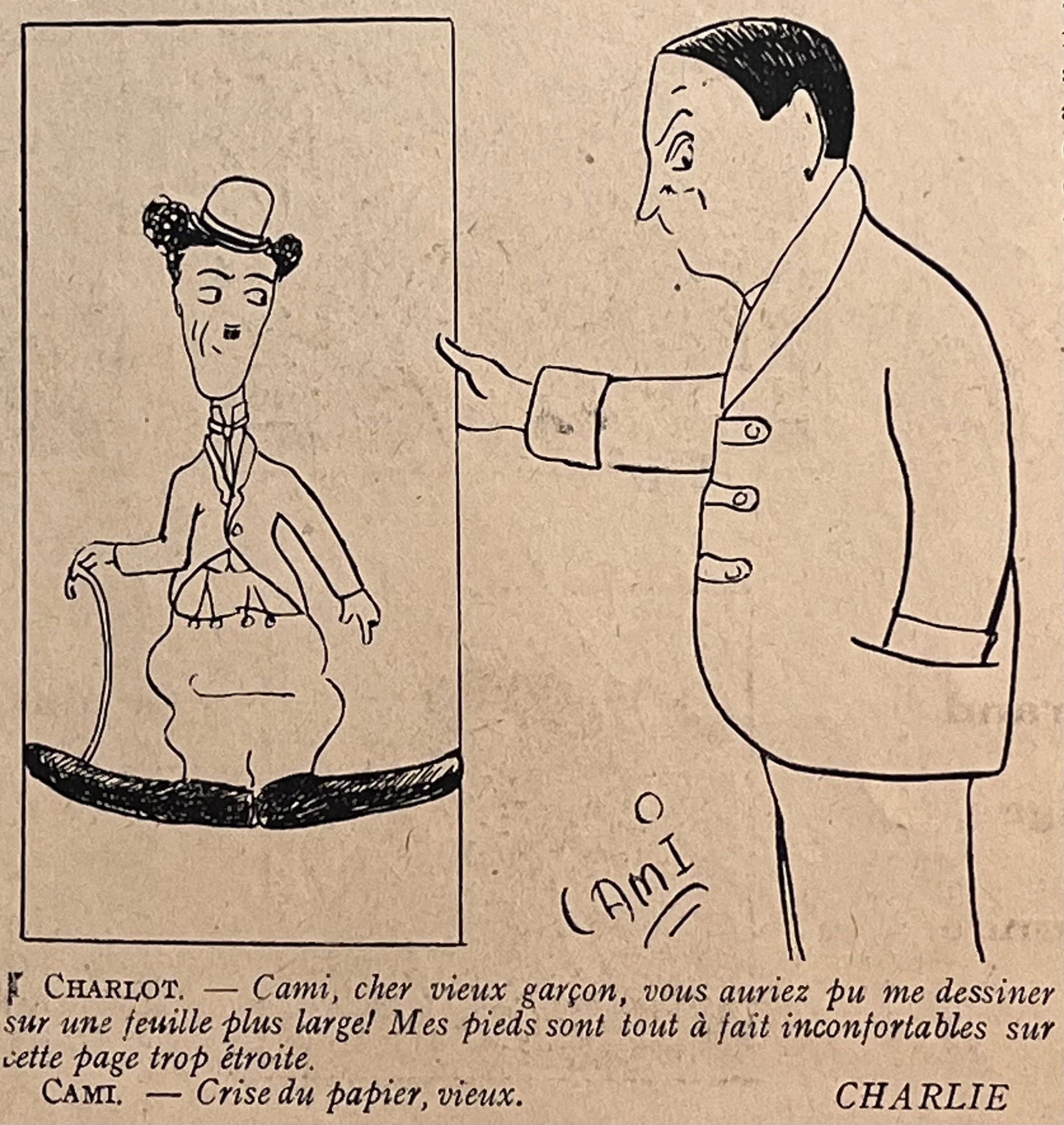 In each vignette, the humor turns on scale and constraint: oversized envelopes, pages drawn too narrow, and Charlot boxed in by his own paper. The French captions underline the joke, with Charlie complaining about cramped feet and Cami blaming a “paper crisis” (Crise du papier). Even these modest scenes carry Cami’s dry, self-aware charm.
