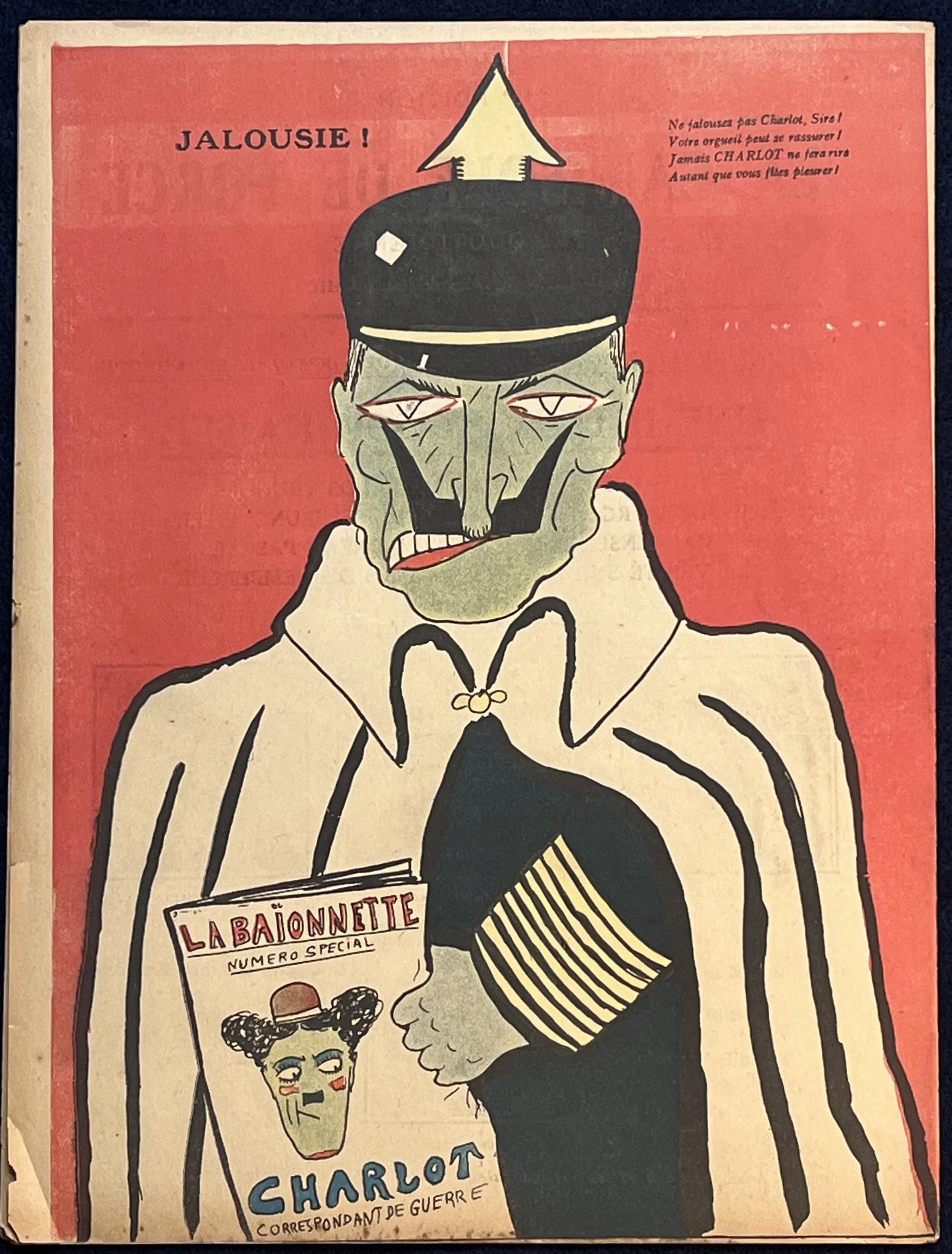 In this final image, Cami heightens the rivalry between Charlot and the Kaiser into a bold, poster-like composition. The stark red ground and exaggerated features push the Kaiser toward pure caricature, clutching a Baïonnette issue that celebrates Charlot instead. Cami’s humor lands in the contrast between swagger and insecurity, ending the series on a sharp, theatrical note.