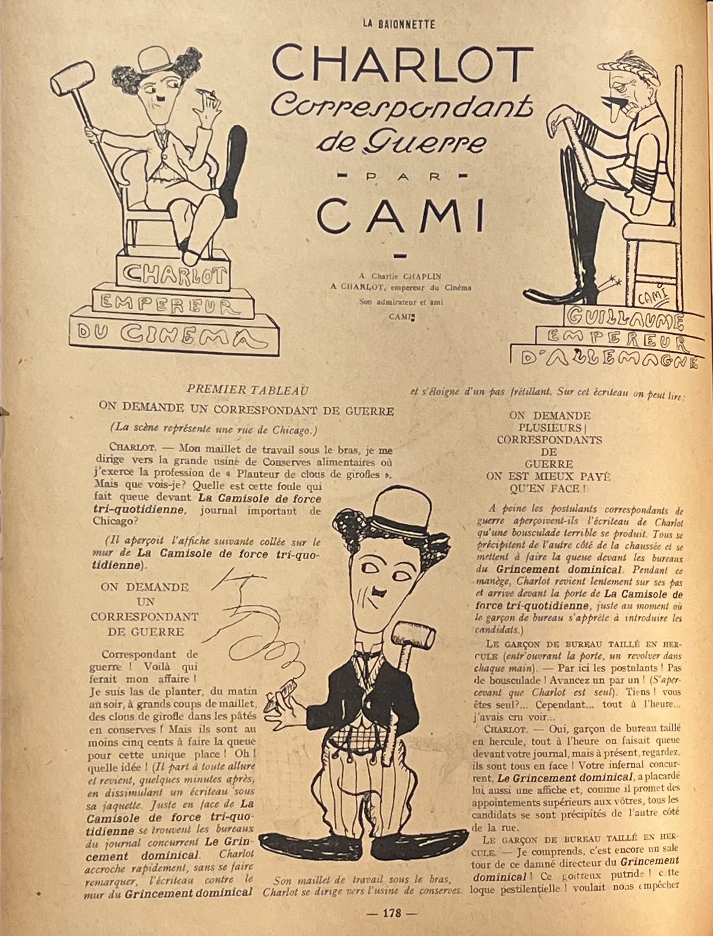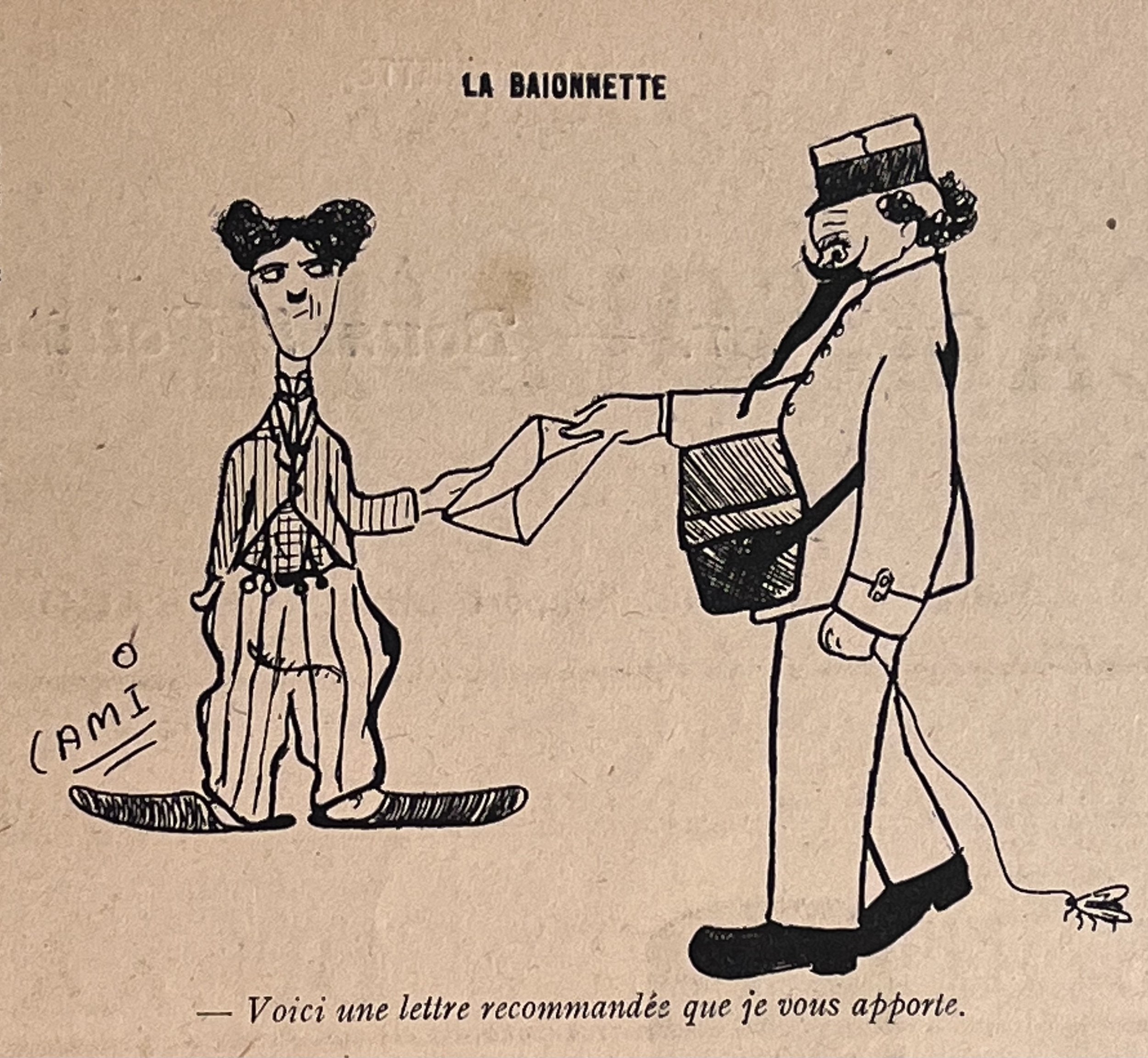 Pierre-Henri Cami (1884-1958) was a French humorist, writer and cartoonist whose blend of absurdity and caricature earned him wide popular success from the 1910s onward. His drawings for La Baïonnette placed “Charlot” and contemporary figures—often including “the Kaiser” (Wilhelm II)—into exaggerated comic encounters that highlighted the theatrical side of political and military life. Cami’s distinctive line work and burlesque imagination allowed him to critique authority through humor rather than direct polemic, giving his wartime illustrations a tone that is playful, pointed and unmistakably his own.