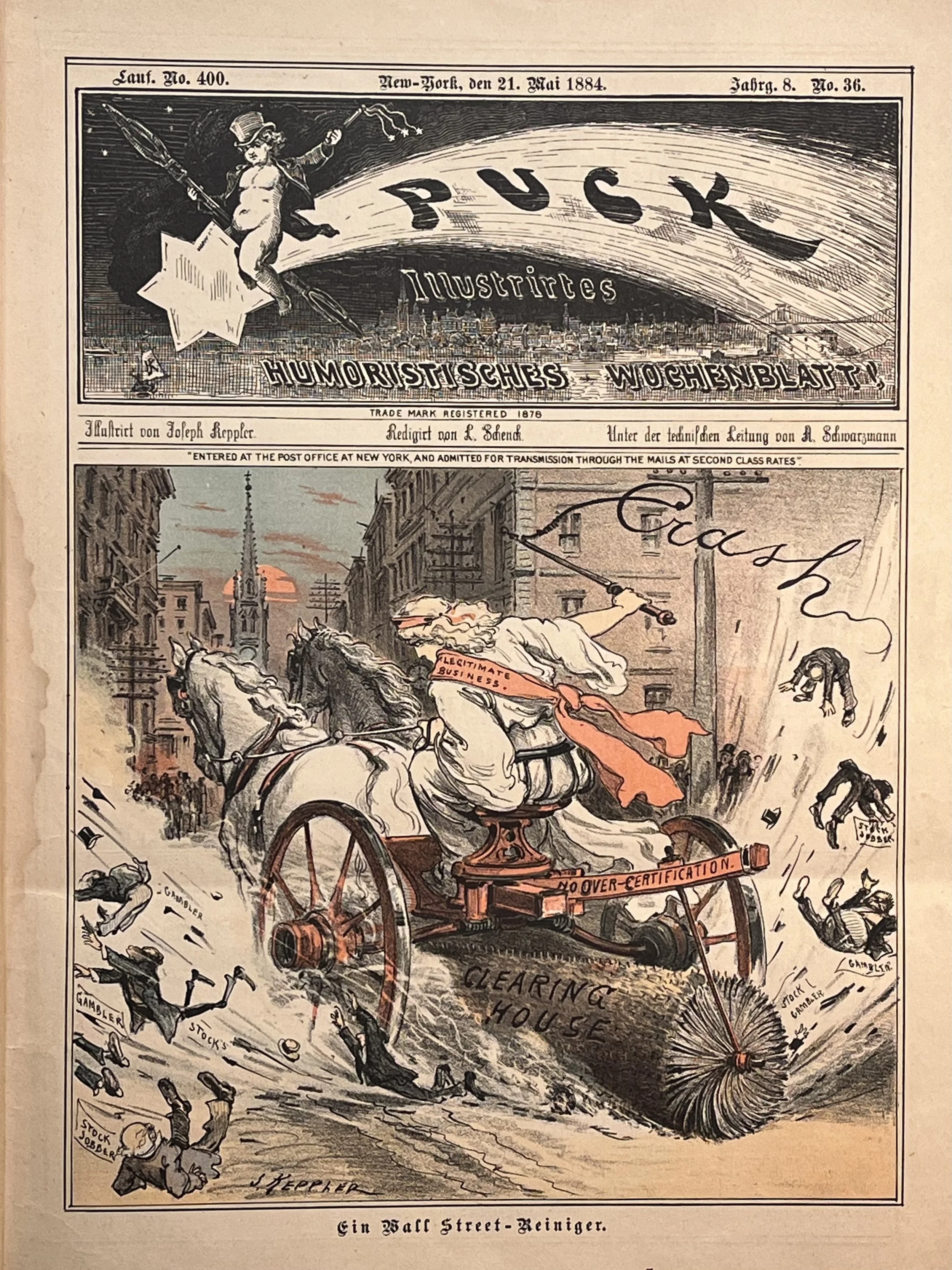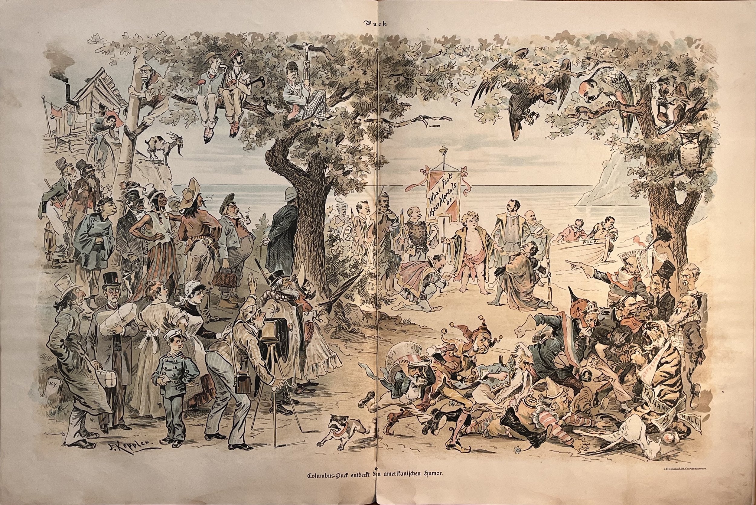 Keppler’s importance lies not only in his drawings but in the institutions he built. After several short-lived German-language satirical weeklies, he founded Puck in 1871, first in St. Louis and later in New York. By 1877, Puck appeared in both German and English editions and quickly became one of the most influential illustrated magazines in the United States. Its use of large-format, color lithographic cartoons transformed political satire into a mass visual language, displayed prominently on newsstands and read well beyond elite audiences.