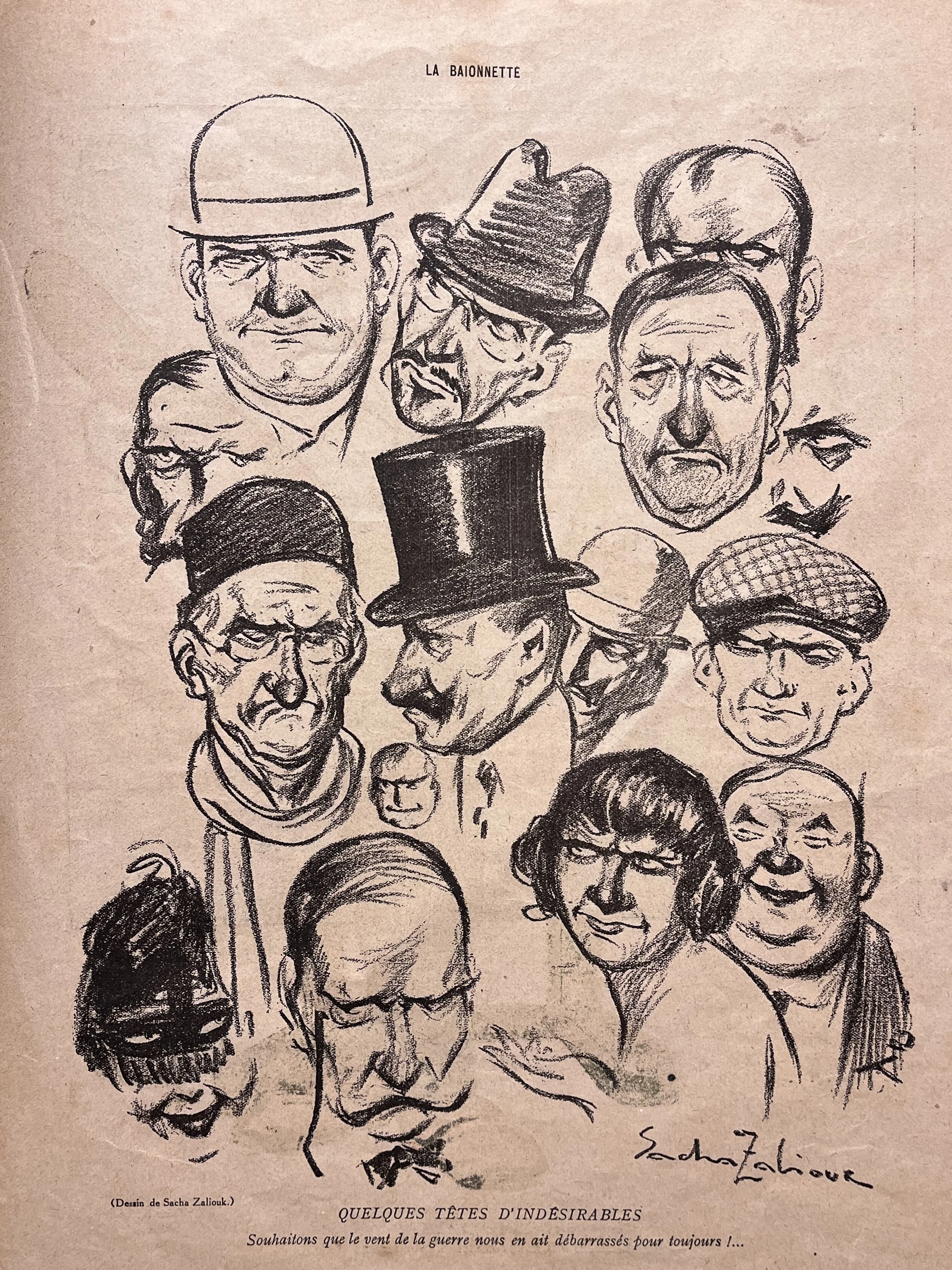 His career moved between painting, magazine illustration, cabaret work, and social satire. He contributed to journals such as La Vie Parisienne, Fantasio, Sourire, and La Baïonnette, and participated in collective Montparnasse projects, including the artist group La Horde. The German occupation limited his work during World War II, yet he continued drawing into old age and remained anchored in Montparnasse until his death in 1971. All Zaliouk pieces in this archive come from original issues of La Baïonnette.