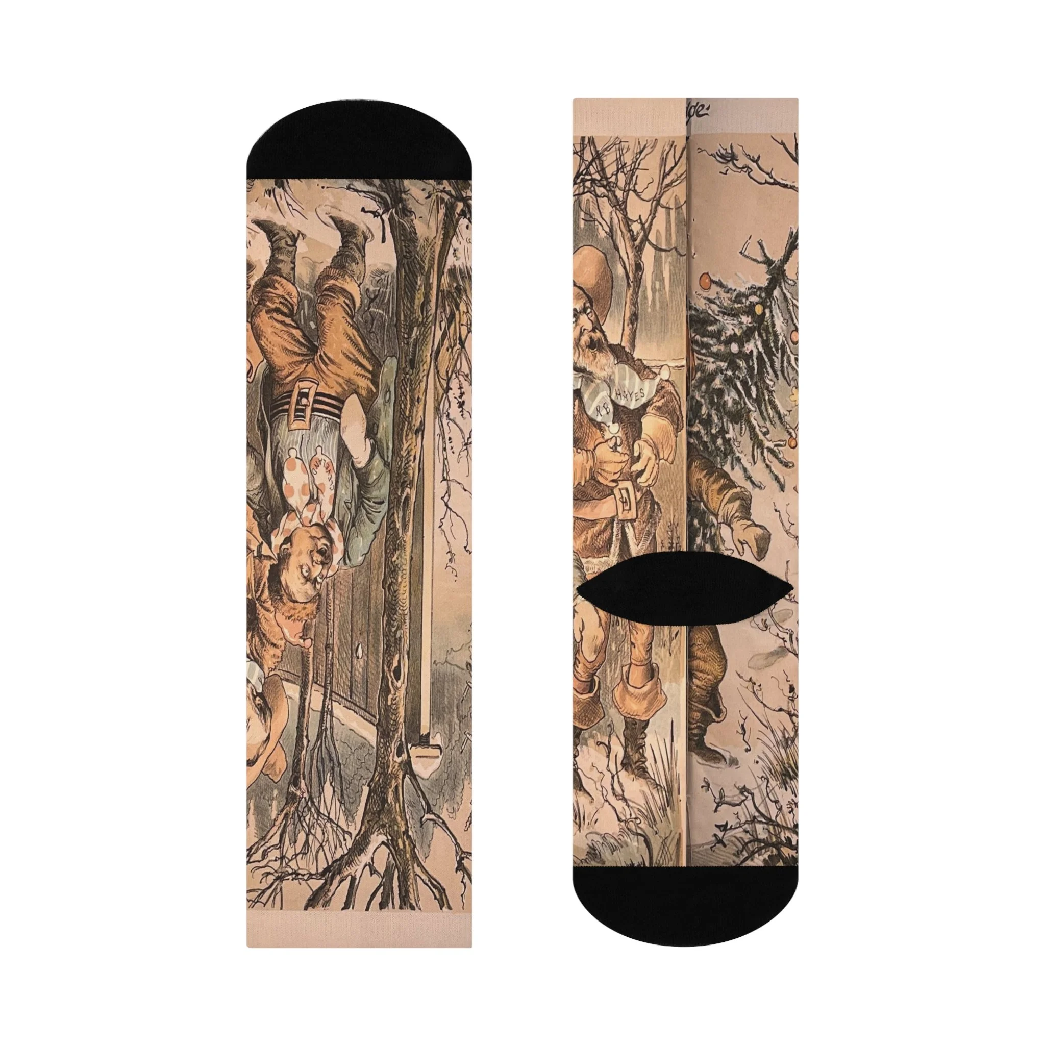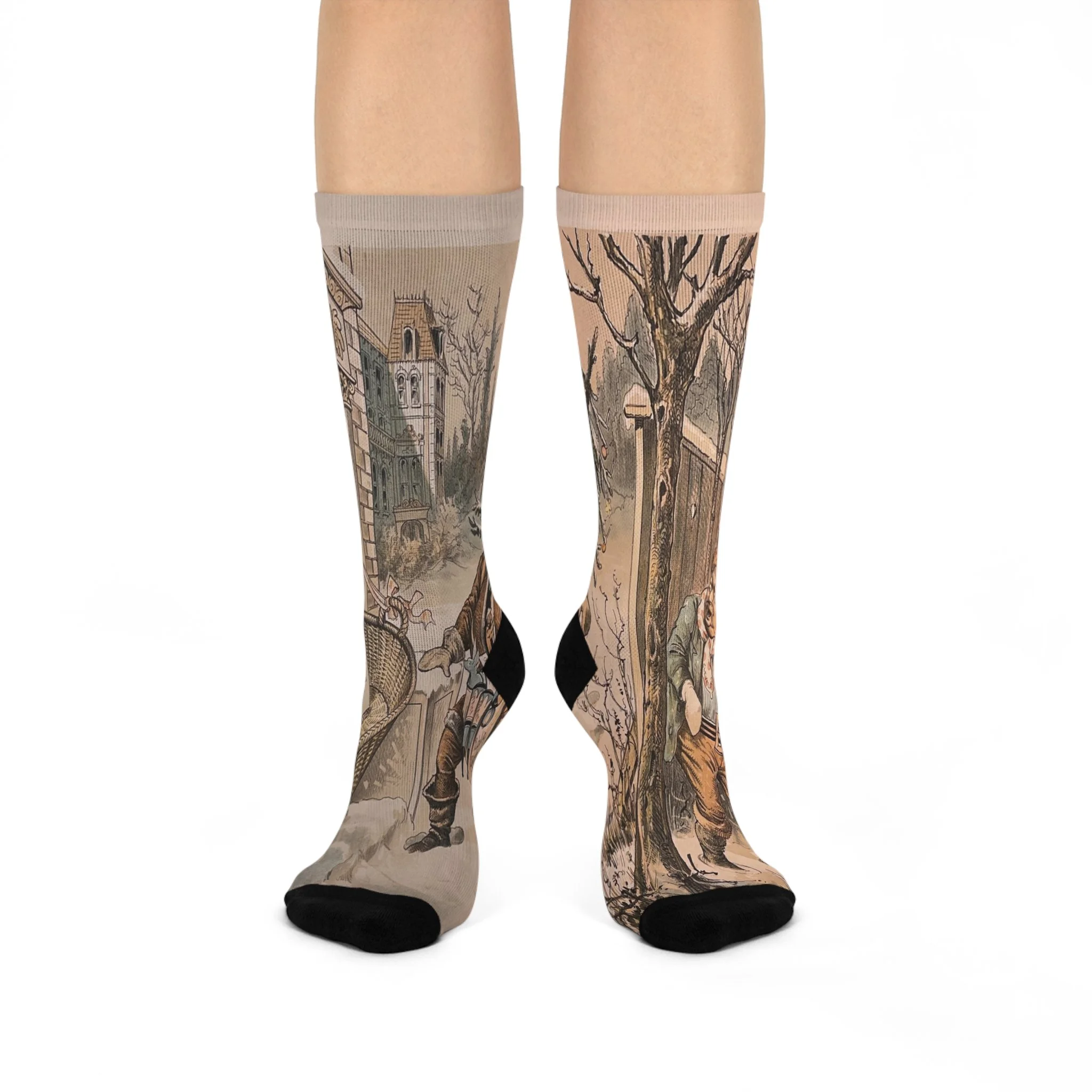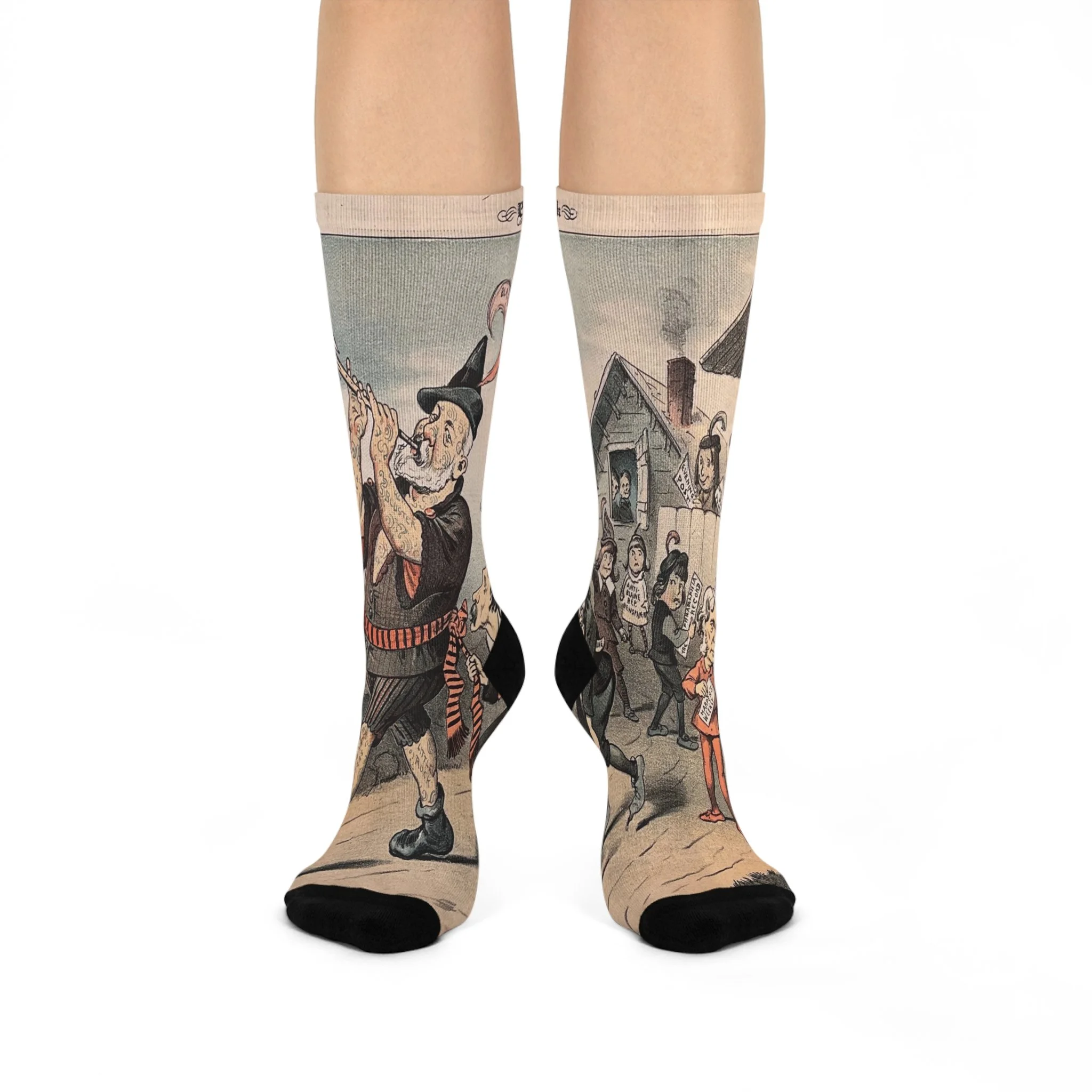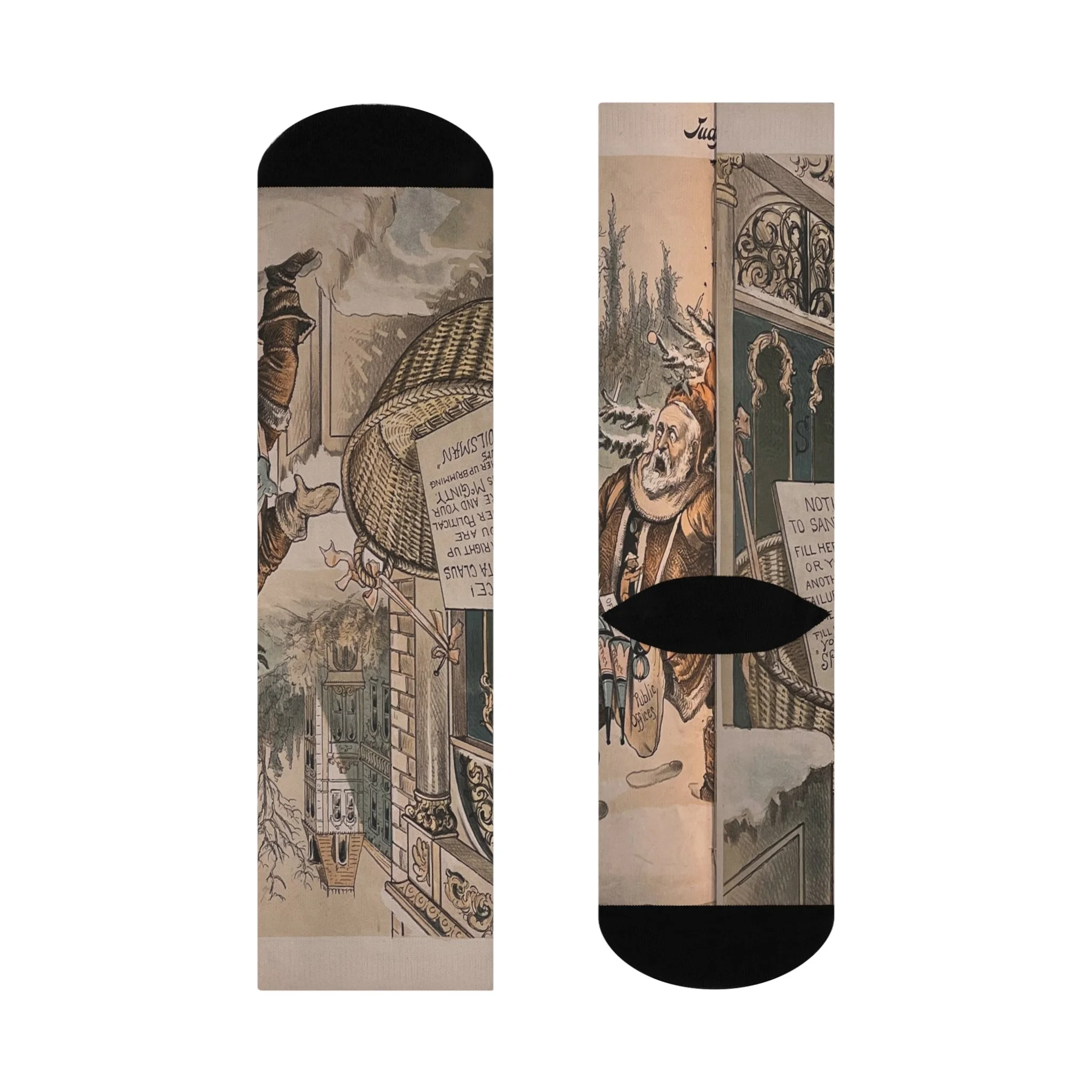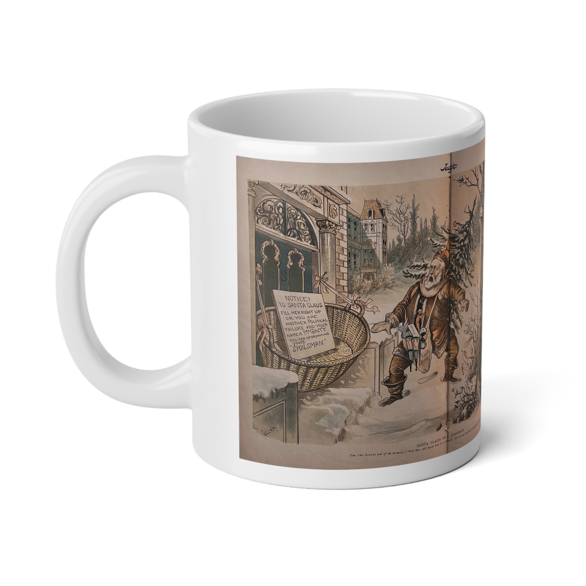 Santa Claus in a Quandary appeared in Judge Magazine during the height of the Gilded Age fights over the Republican “spoils system.” Here, President Benjamin Harrison—drawn as a weary Santa—staggers under the weight of impossible political demands, while party bosses Platt and Foraker lurk in the trees demanding their cut of federal appointments. The oversized basket labeled “Fill her right up or you are another political failure” nails the point: corruption wasn’t subtle, it was expected. Judge’s artists used holiday whimsy to expose a very real political rot—how patronage, party pressure, and back-room dealmaking strangled the public interest. More than a century later, the dynamic is painfully familiar: authoritarian movements thrive when loyalty matters more than competence and when political bosses treat democracy like a gift bag to divide among themselves. A sharp piece of historical resistance art, perfect for anyone who believes good governance beats corruption every time.