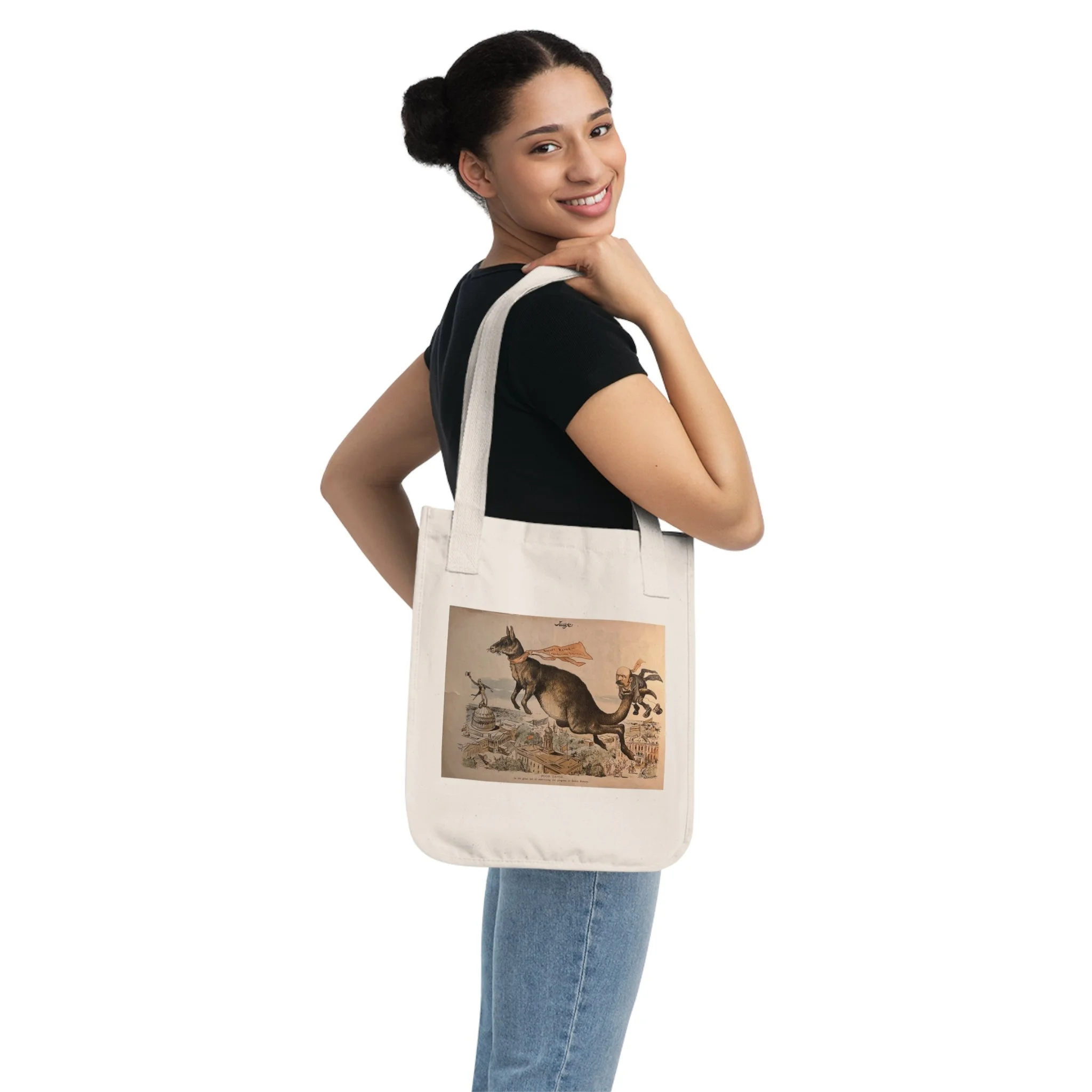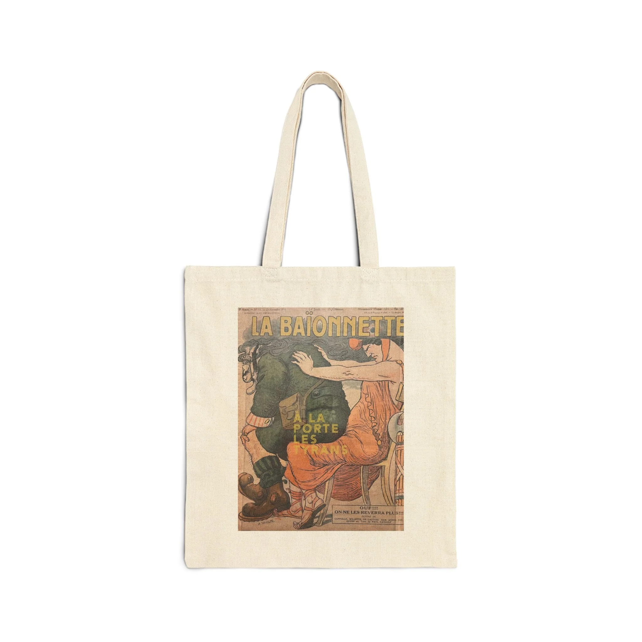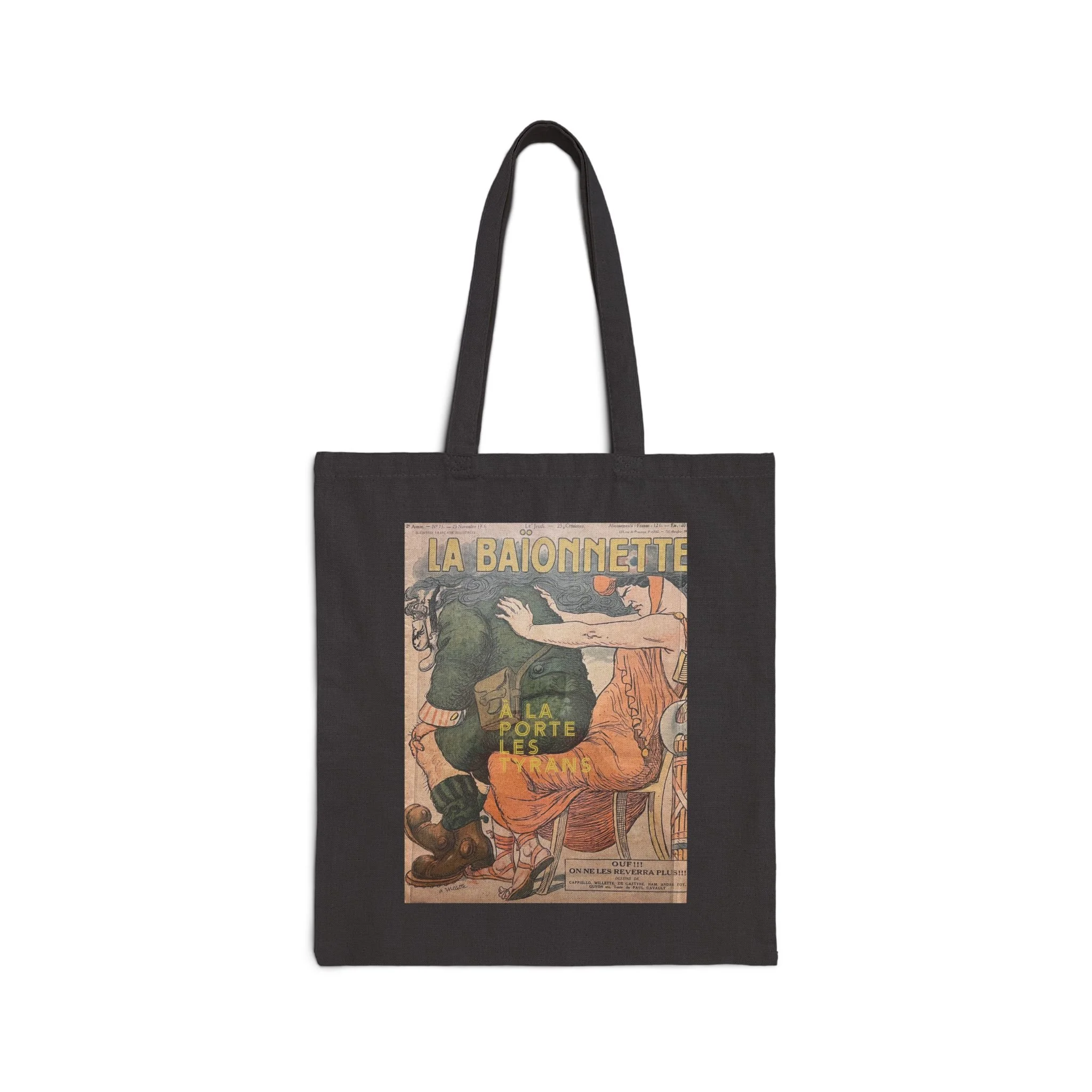 Finally — a tote that tells fascists where to go. Taken from a 1916 French magazine cover and paired with the slogan “À LA PORTE LES TYRANS” (“Out the door, tyrants”), this bag blends vintage art with modern defiance.