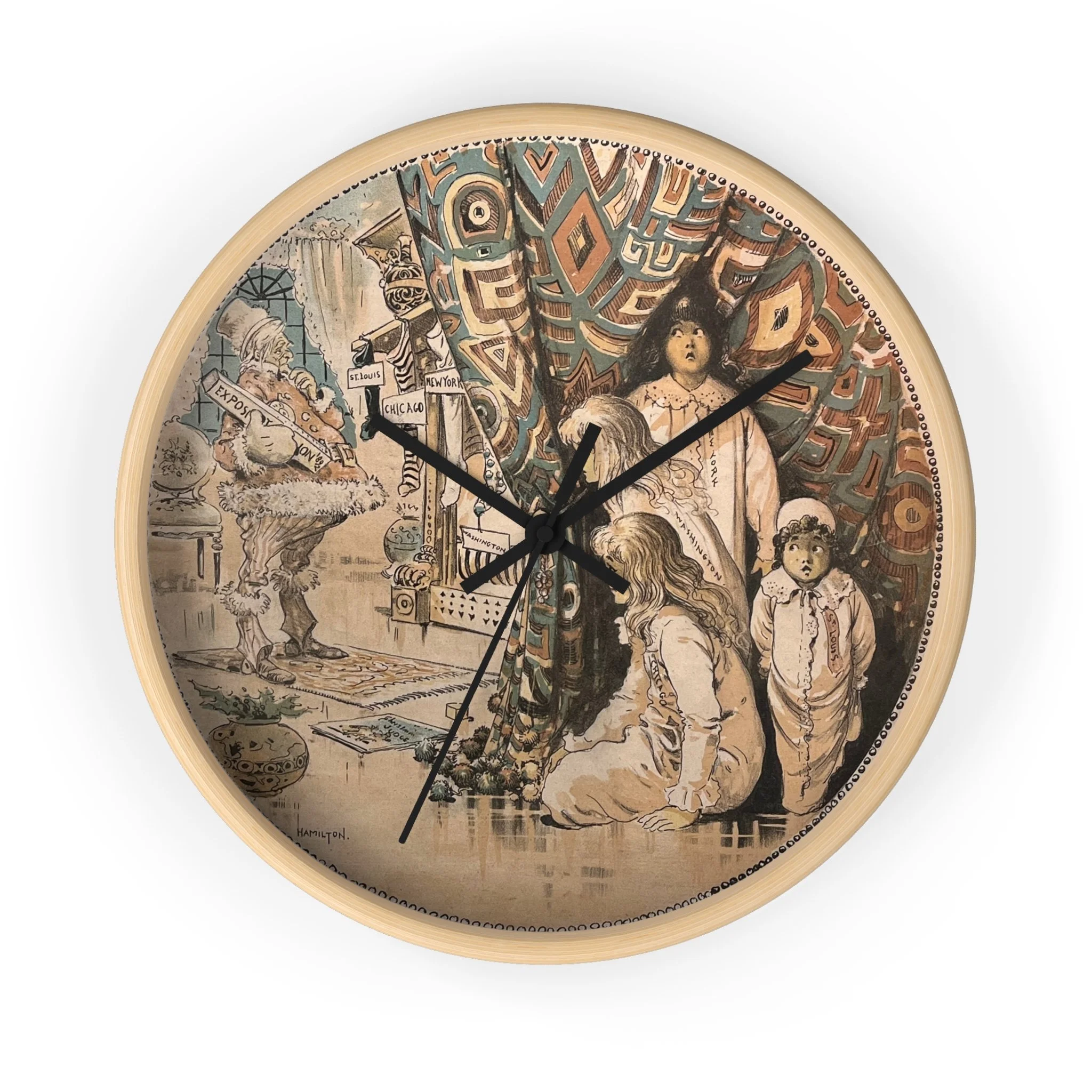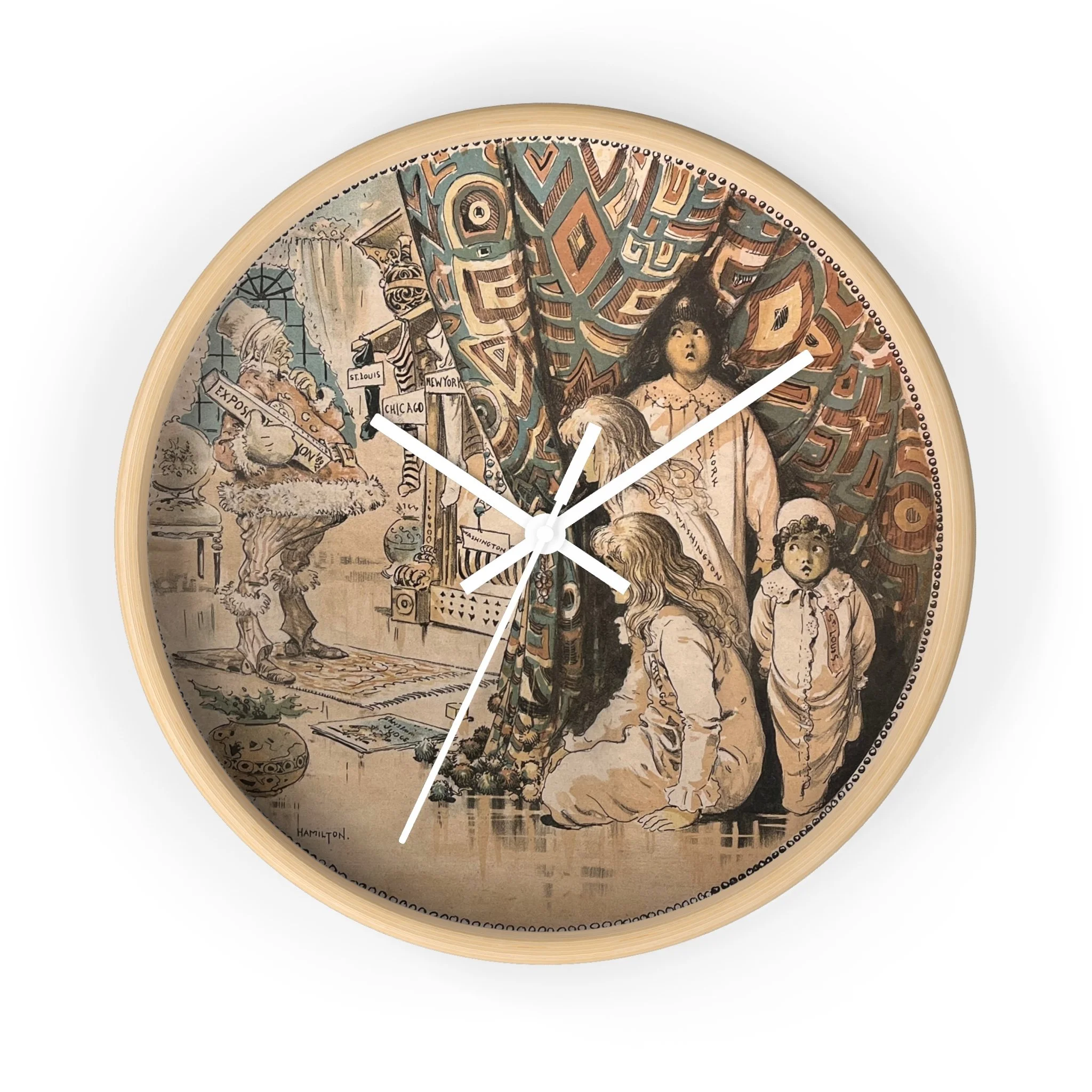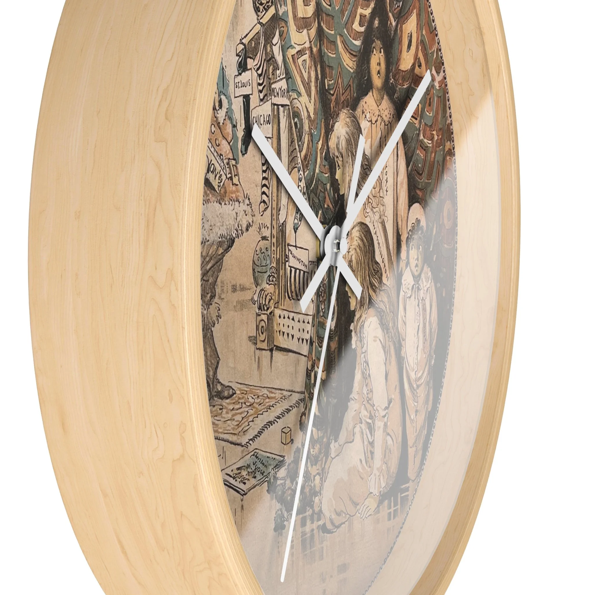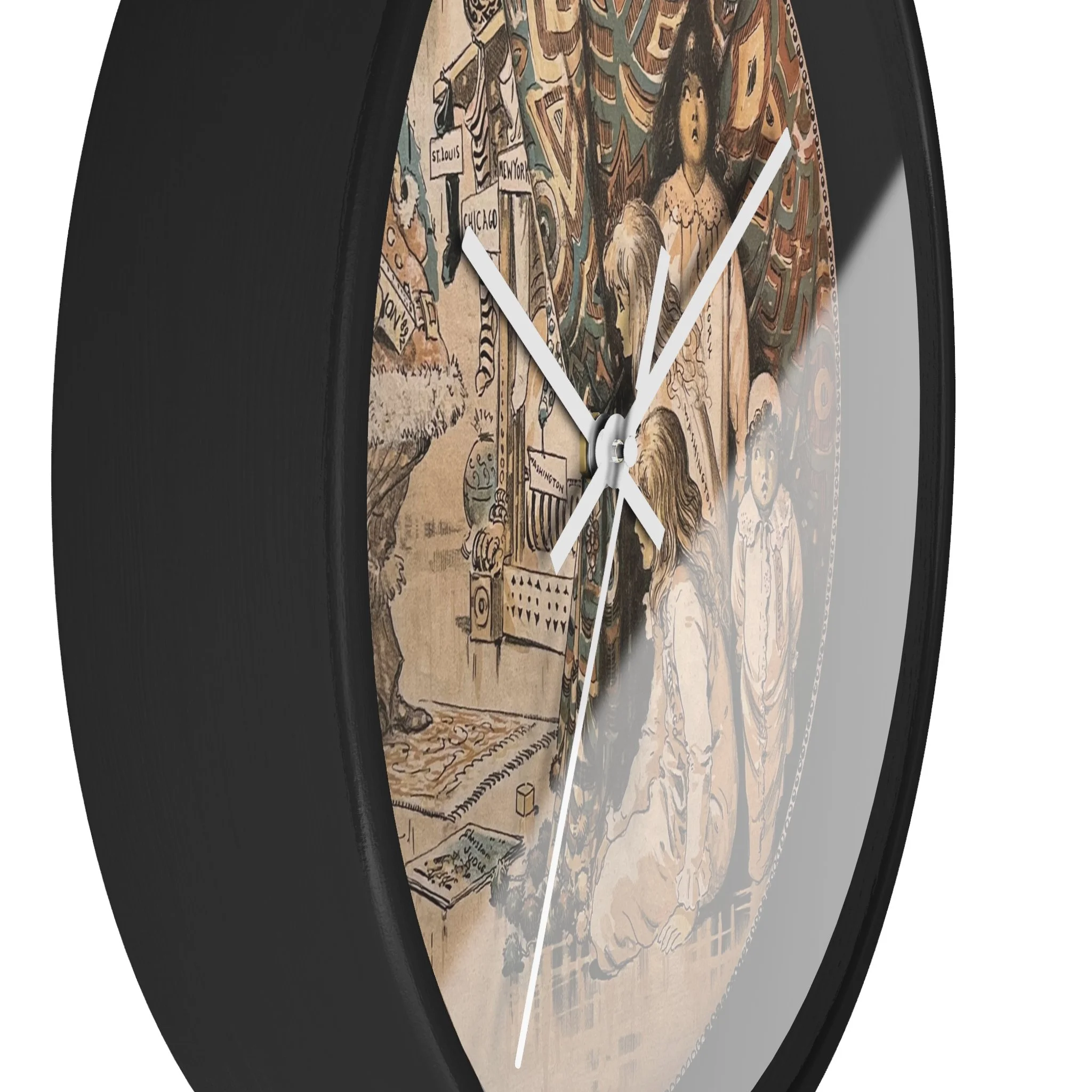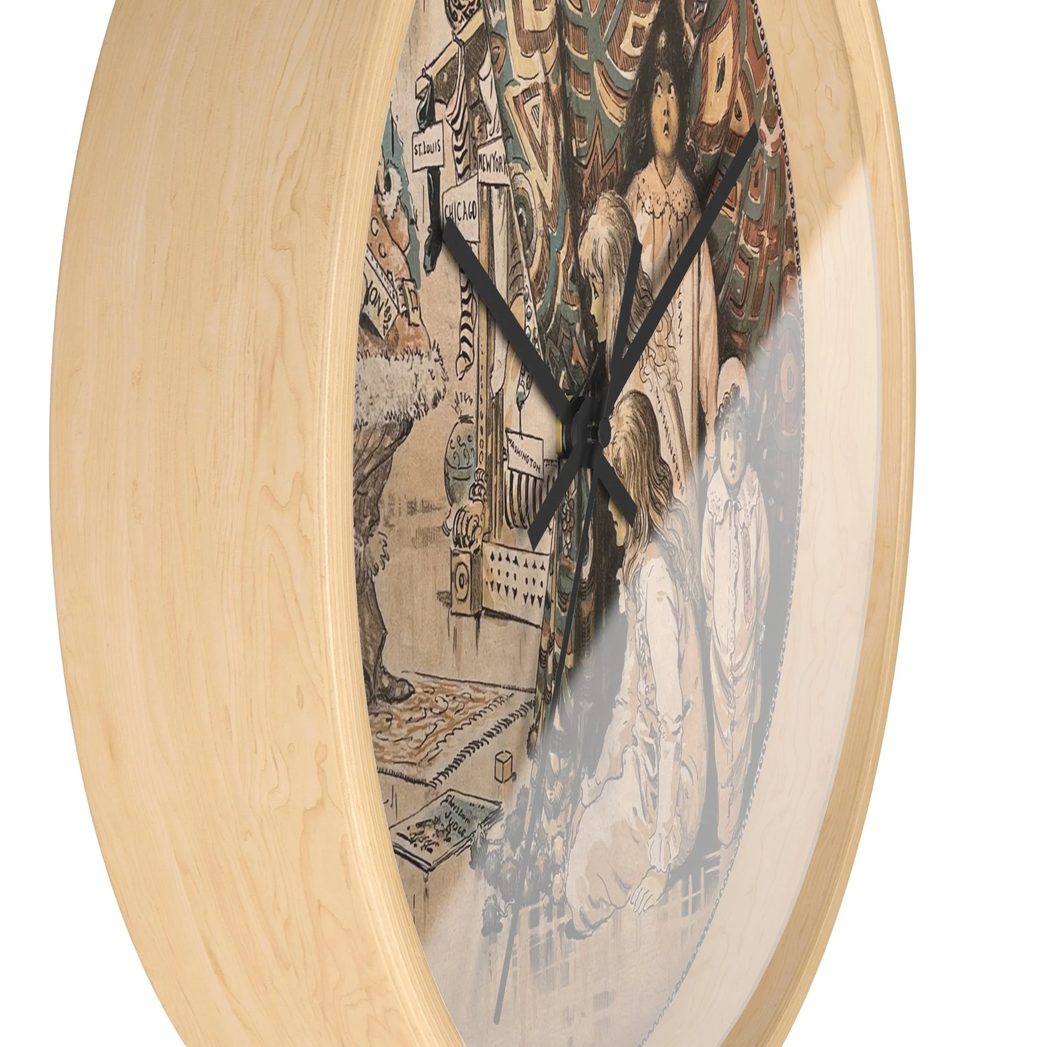 Product features - Available in natural wood, black, or white frames with matching hands - Pre-installed backside hook for easy hanging - Vibrant, high-definition printed illustration on plexiglass face - Silent quartz mechanism; requires one AA battery (not included) - One standard size: 10" x 10" (25.4 x 25.4 cm); for indoor use only Care instructions - Wipe the dust off gently with a clean, dry microfiber cloth