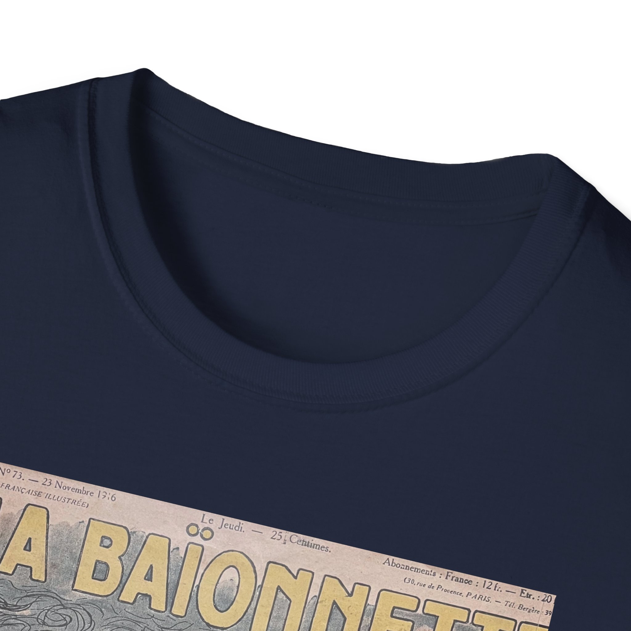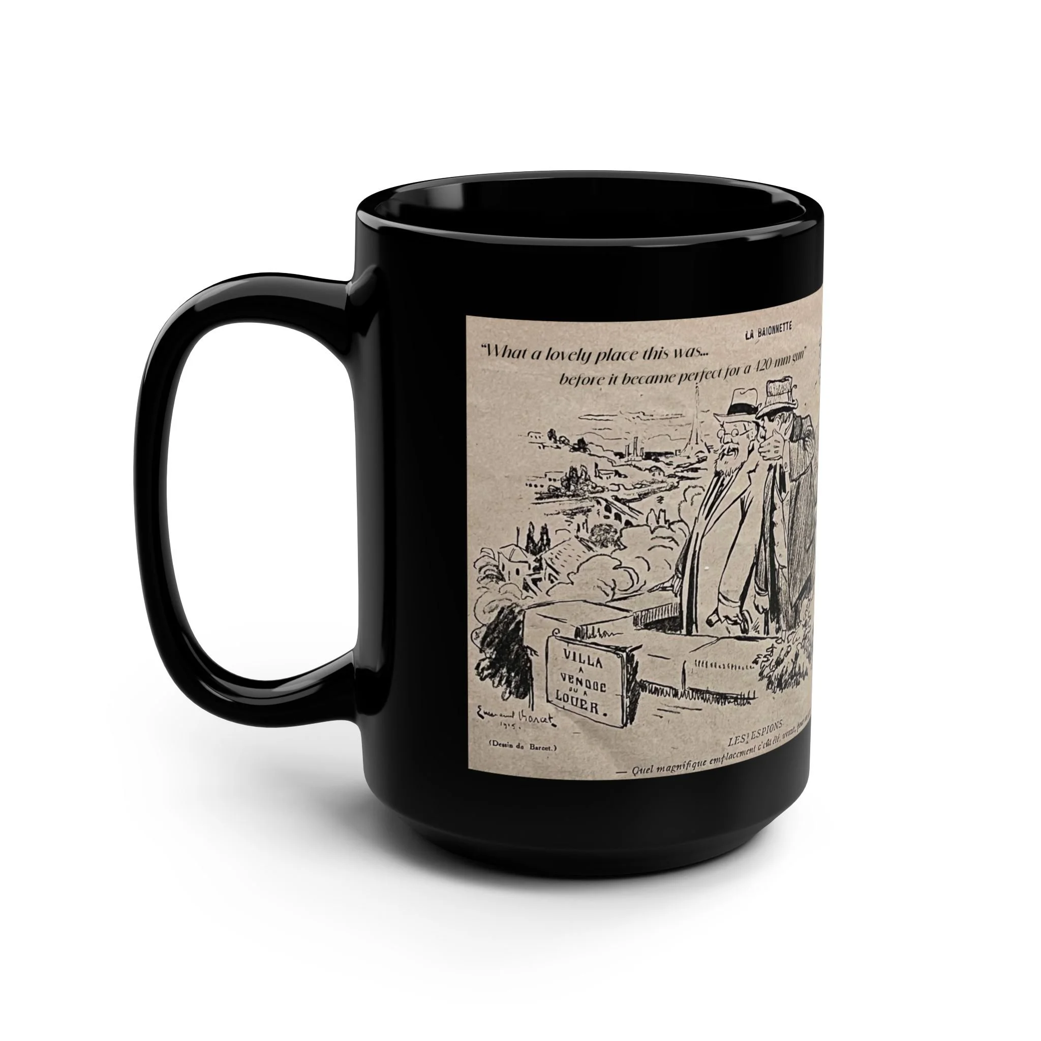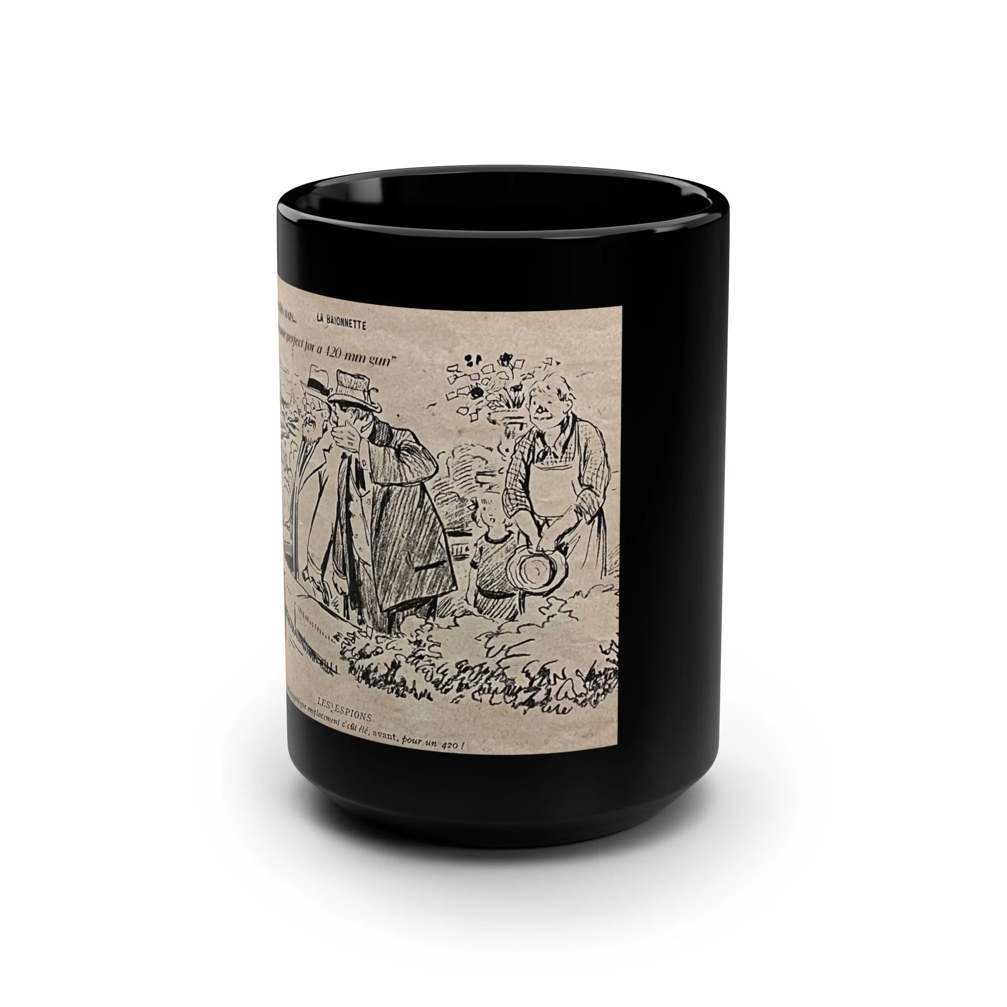 This 1915 La Baïonnette cartoon skewers the militarized paranoia that swept France during World War I. Two refined men peer over a ruined hillside and whisper about how “perfect” it once was for a 420-mm gun — the kind of fear-logic that turns ordinary places into imagined battlegrounds. The joke isn’t the woman; it’s how war rewires civilians to see threats everywhere.