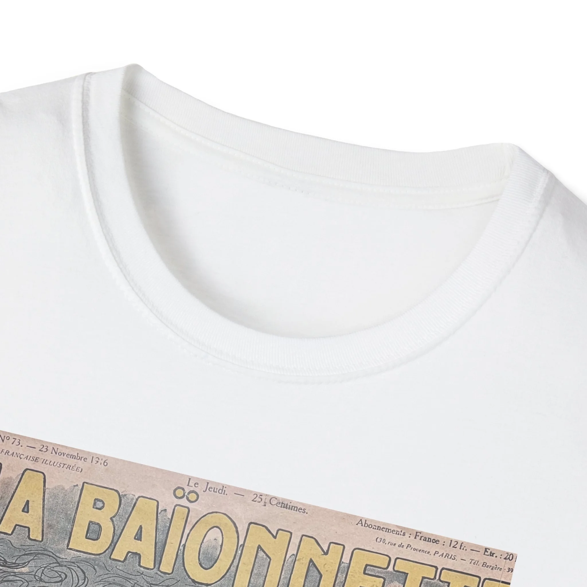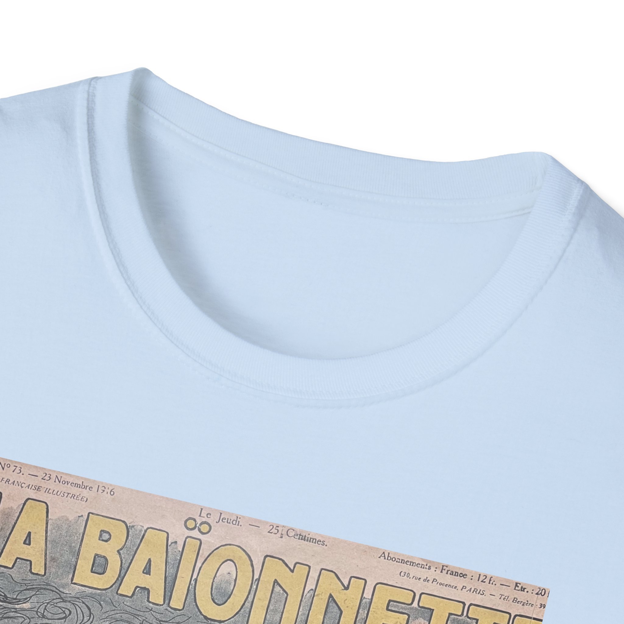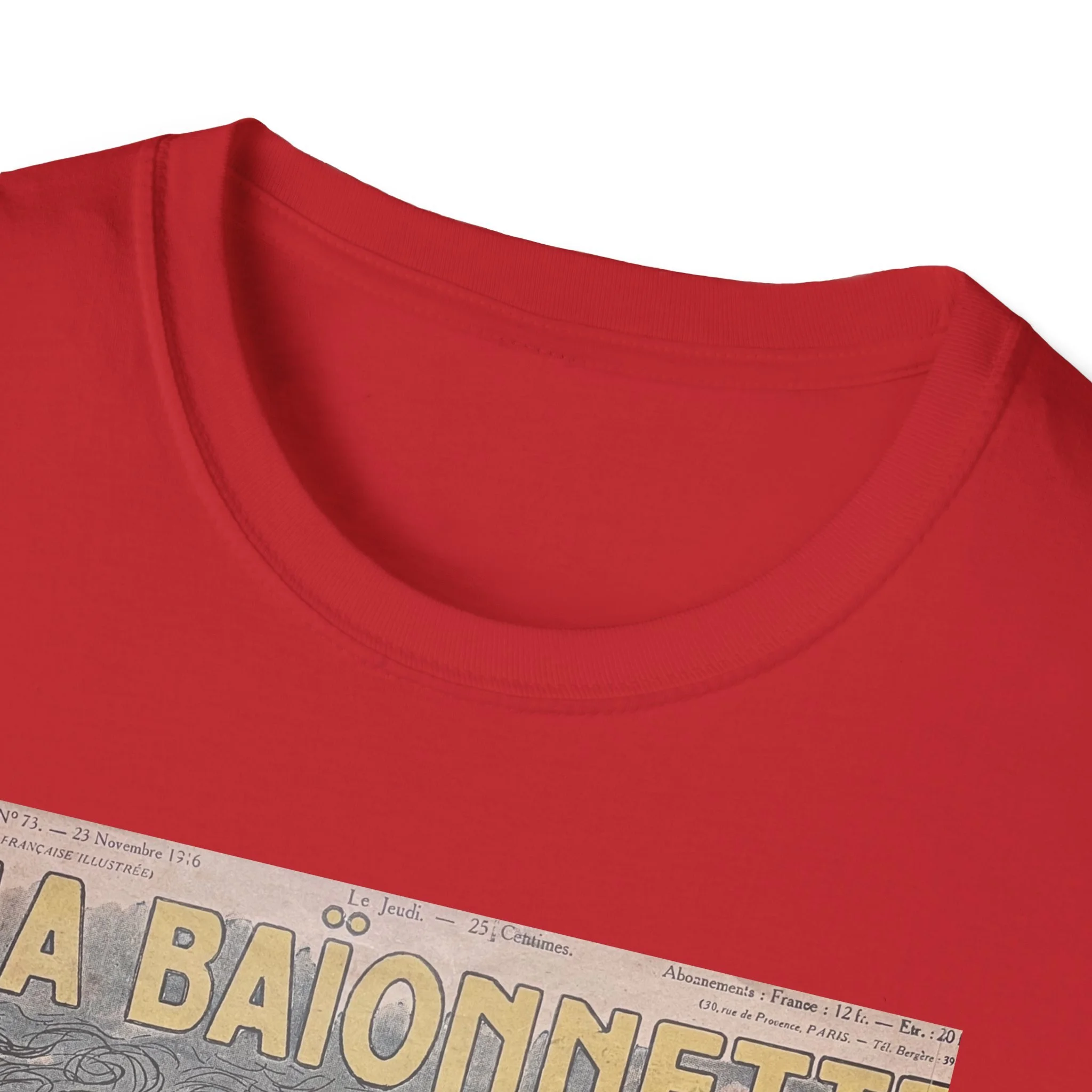 This 1915 La Baïonnette cartoon skewers the militarized paranoia that swept France during World War I. Two refined men peer over a ruined hillside and whisper about how “perfect” it once was for a 420-mm gun — the kind of fear-logic that turns ordinary places into imagined battlegrounds. The joke isn’t the woman; it’s how war rewires civilians to see threats everywhere.