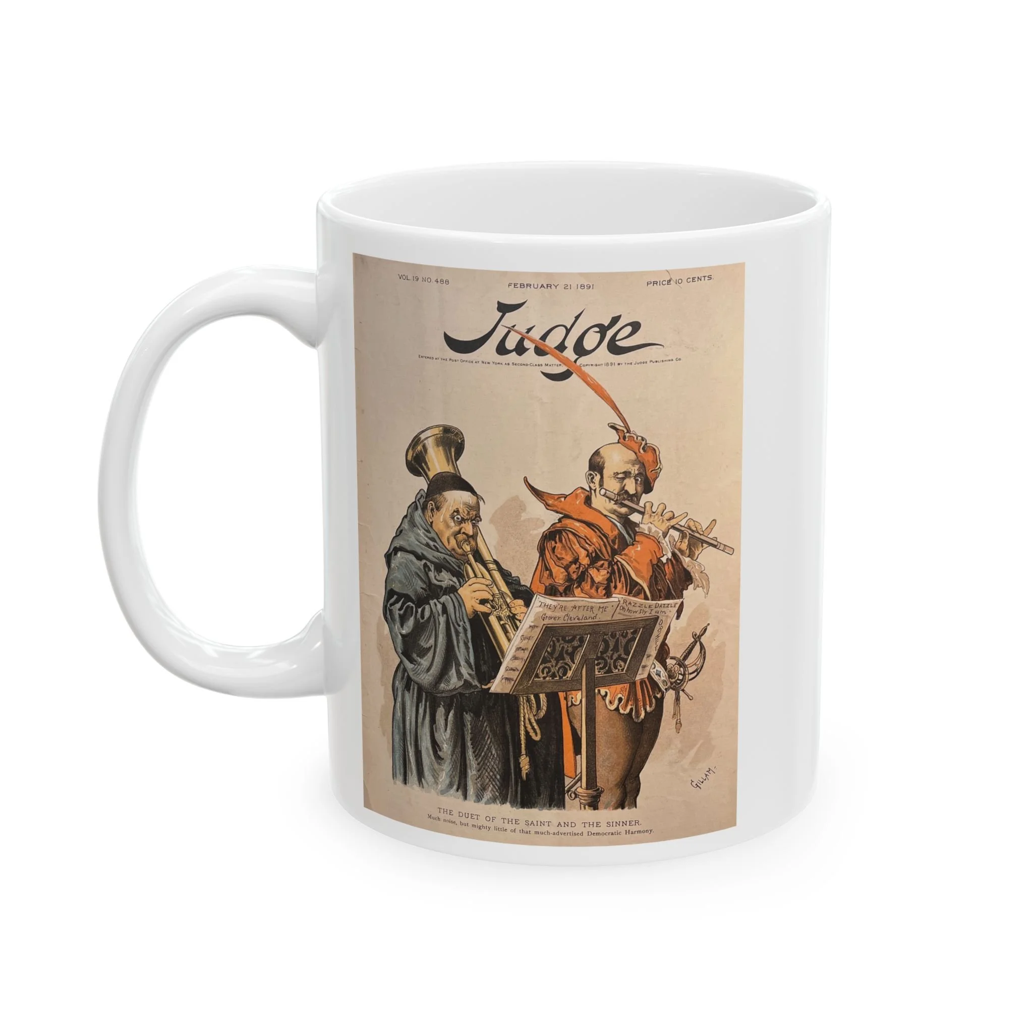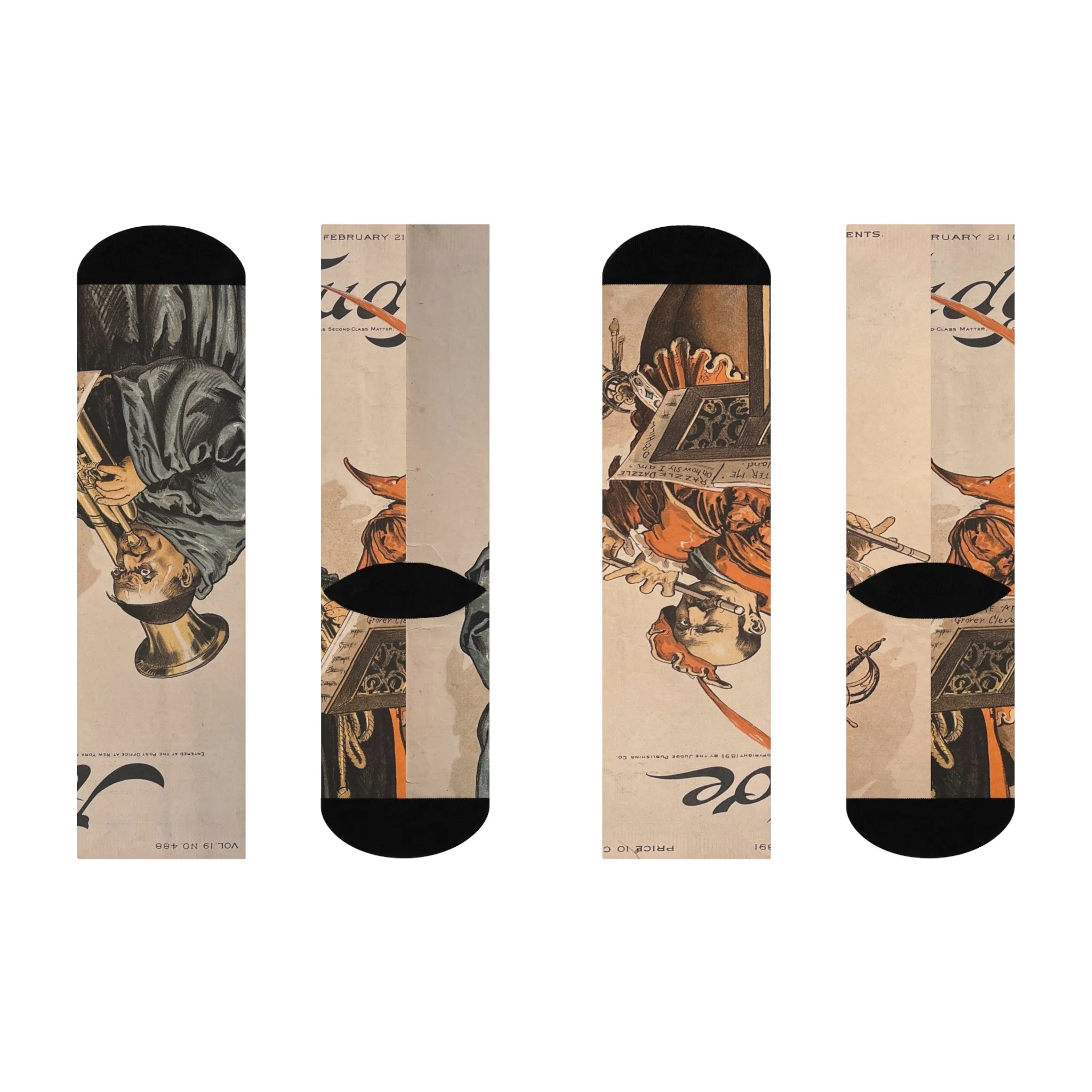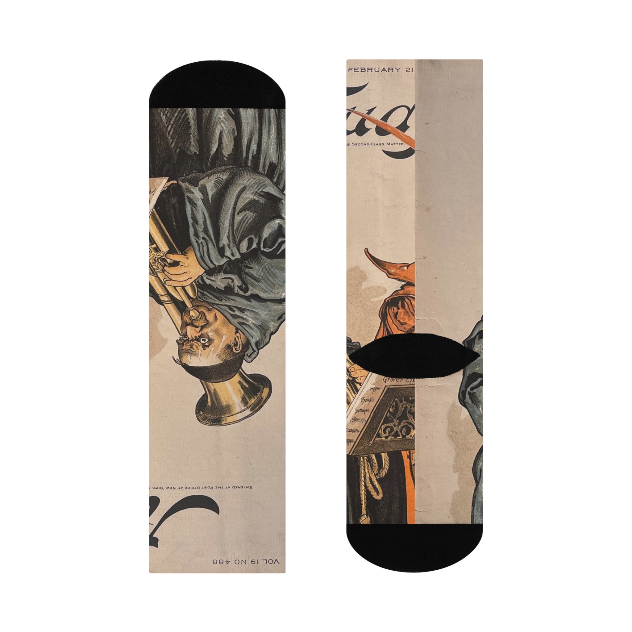 This 1891 Judge Magazine cover skewers political theatrics long before Twitter ever existed. A monk and a court jester—one solemn, one scheming—attempt a “duet” that’s really just noisy, mismatched chaos. Their sheet music jokes about “They’re after me” and “Razzle Dazzle,” mocking politicians who talk harmony while delivering nothing but discord. A century later, the message still lands: when politicians substitute drama for substance, when ego drowns out governance, democracy suffers. This restored vintage piece is part of The Antifascist Shop’s mission to bring real historical satire back into the present fight—because political dysfunction has always been a warning sign, and these old cartoons saw it coming.