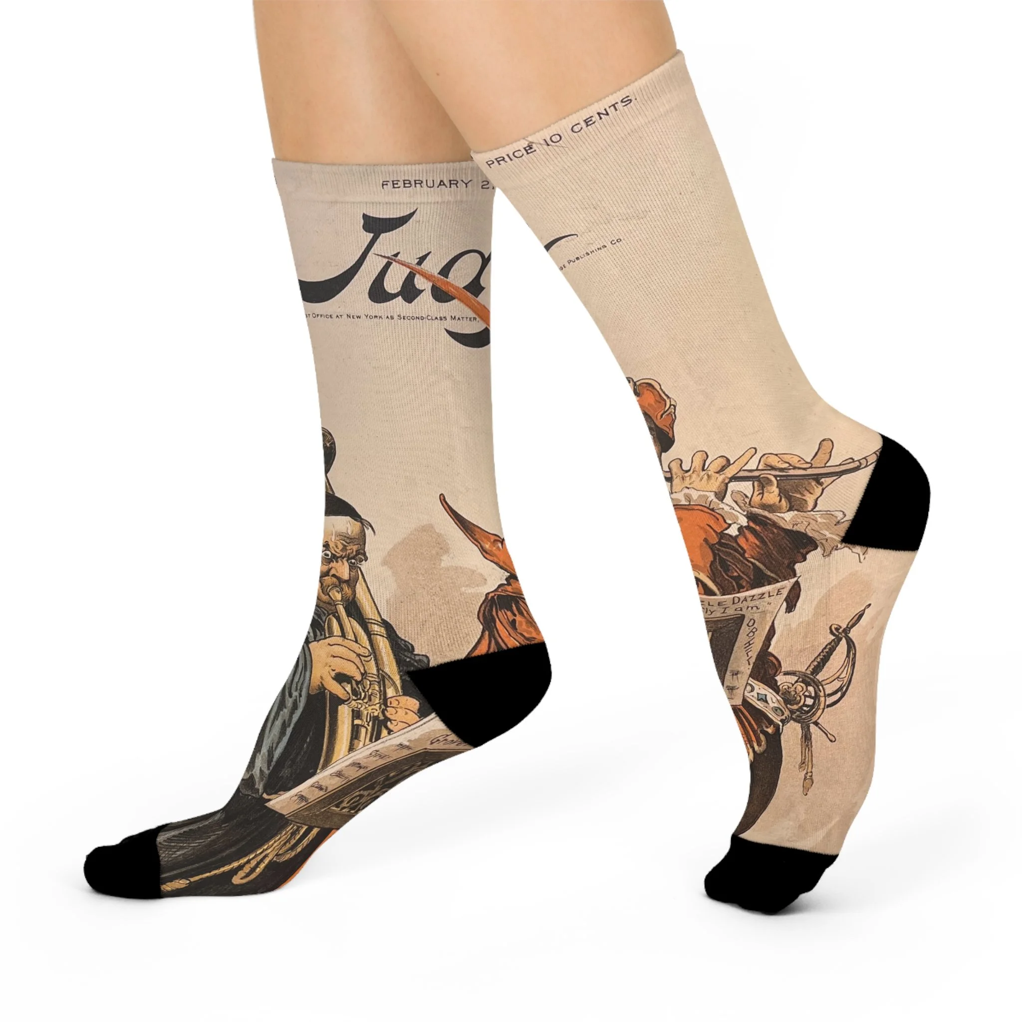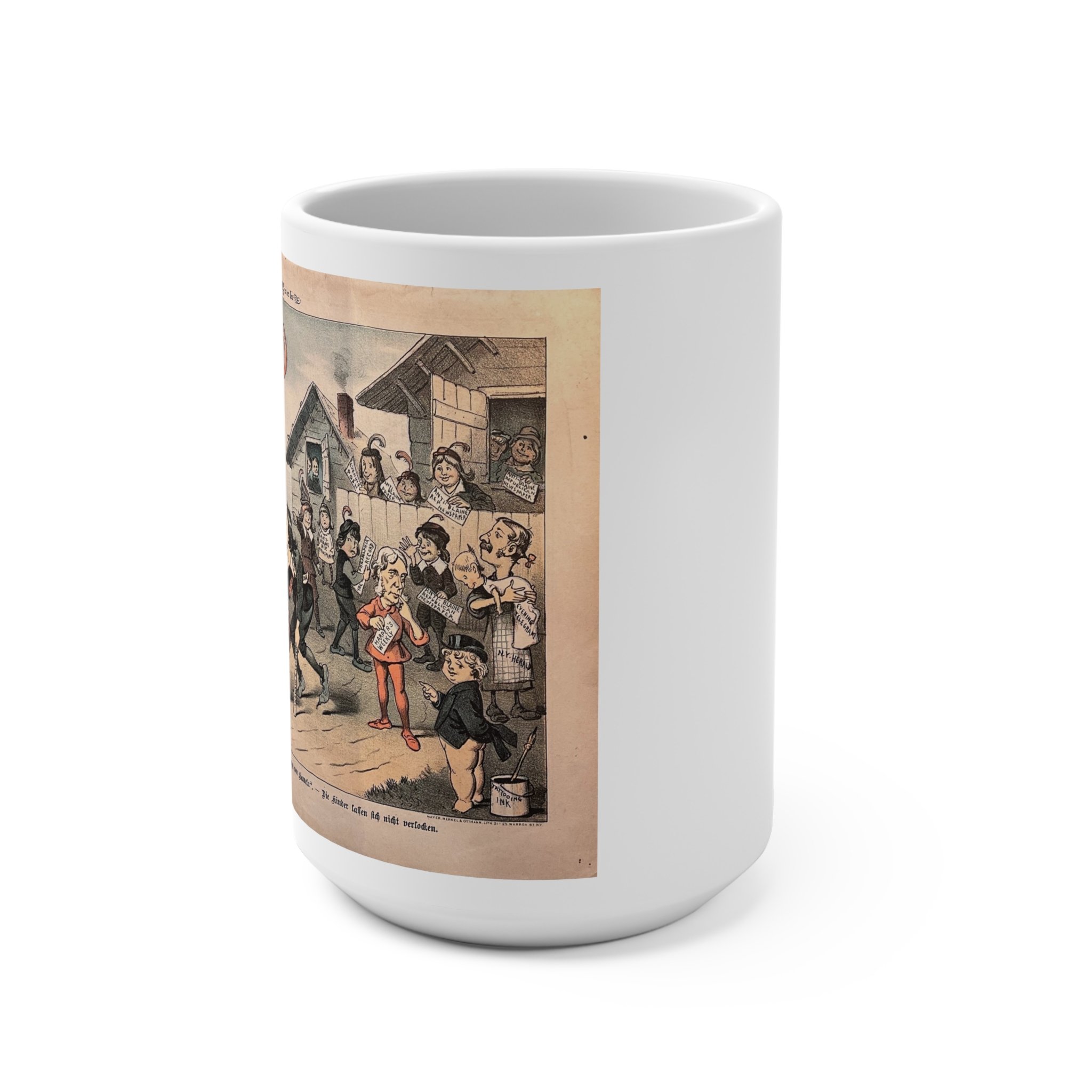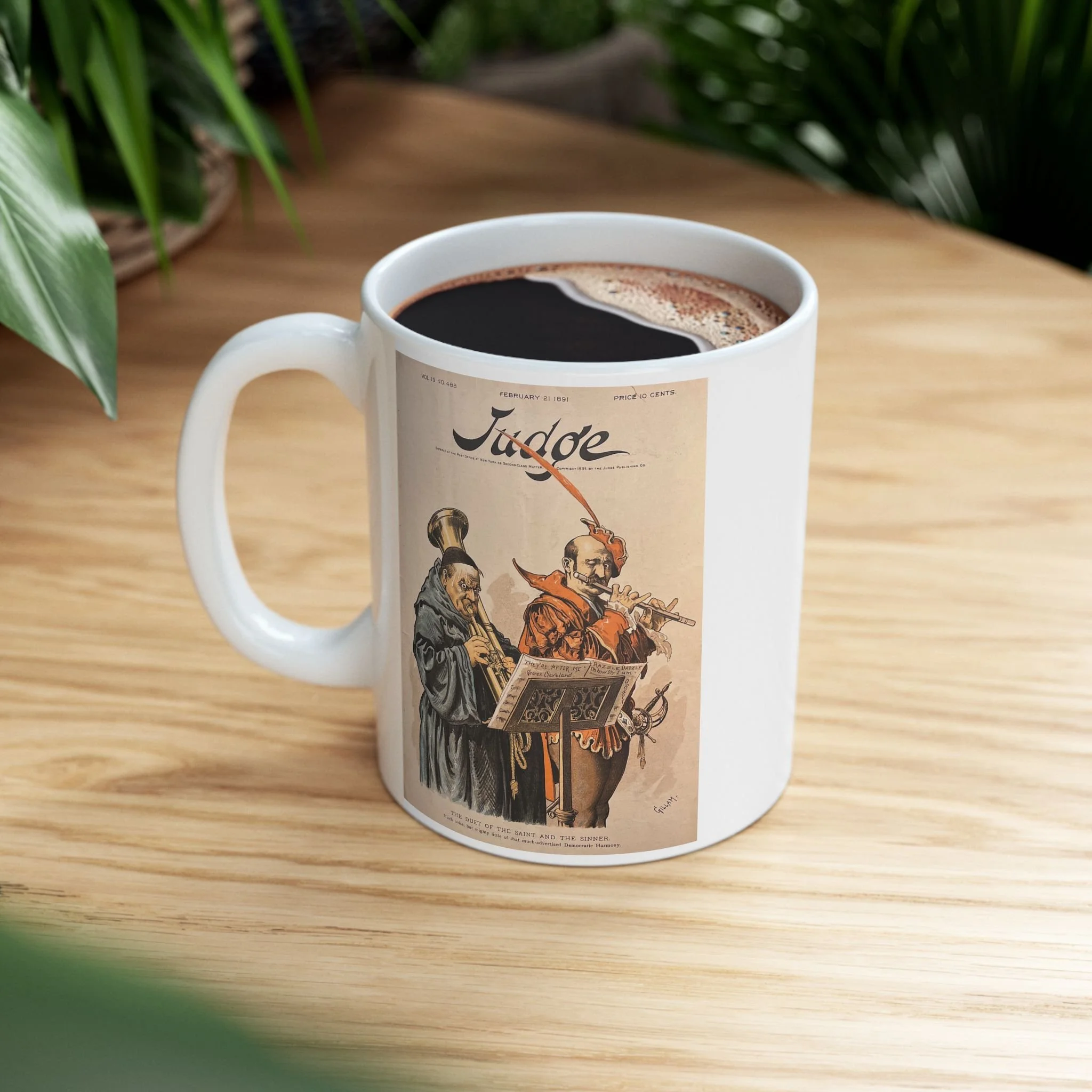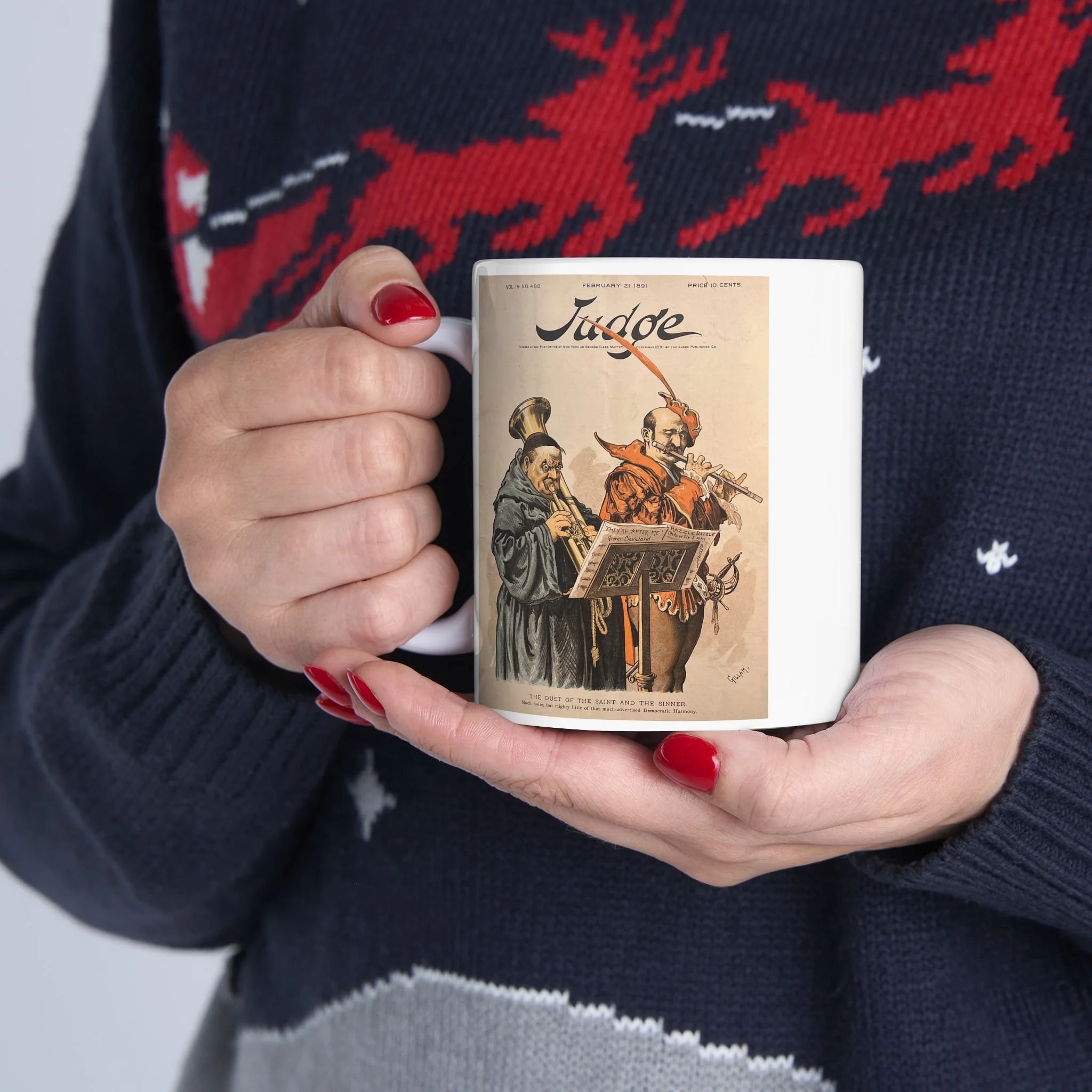 This 1891 Judge Magazine cover skewers political theatrics long before Twitter ever existed. A monk and a court jester—one solemn, one scheming—attempt a “duet” that’s really just noisy, mismatched chaos. Their sheet music jokes about “They’re after me” and “Razzle Dazzle,” mocking politicians who talk harmony while delivering nothing but discord. A century later, the message still lands: when politicians substitute drama for substance, when ego drowns out governance, democracy suffers. This restored vintage piece is part of The Antifascist Shop’s mission to bring real historical satire back into the present fight—because political dysfunction has always been a warning sign, and these old cartoons saw it coming.