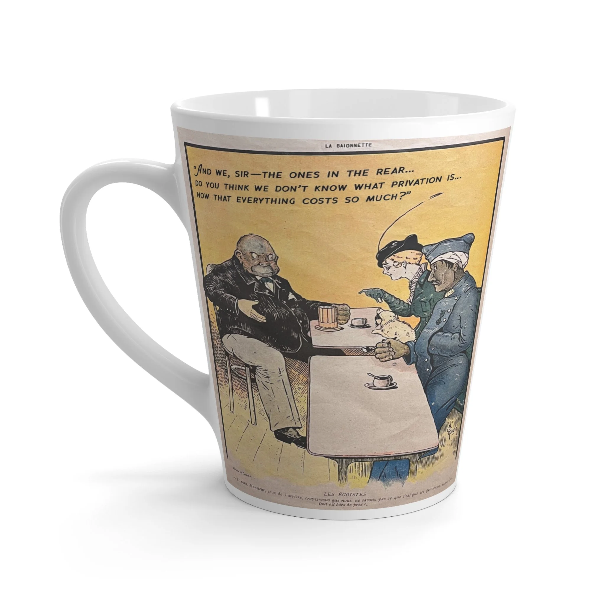 This 1916 La Baïonnette cartoon captures a pattern we still know too well: the comfortable lecturing the wounded about “sacrifice.” A plump rear-guard bourgeois complains about rising prices while a frontline soldier sits bandaged beside him—an early reminder that privilege has always tried to borrow the language of suffering.