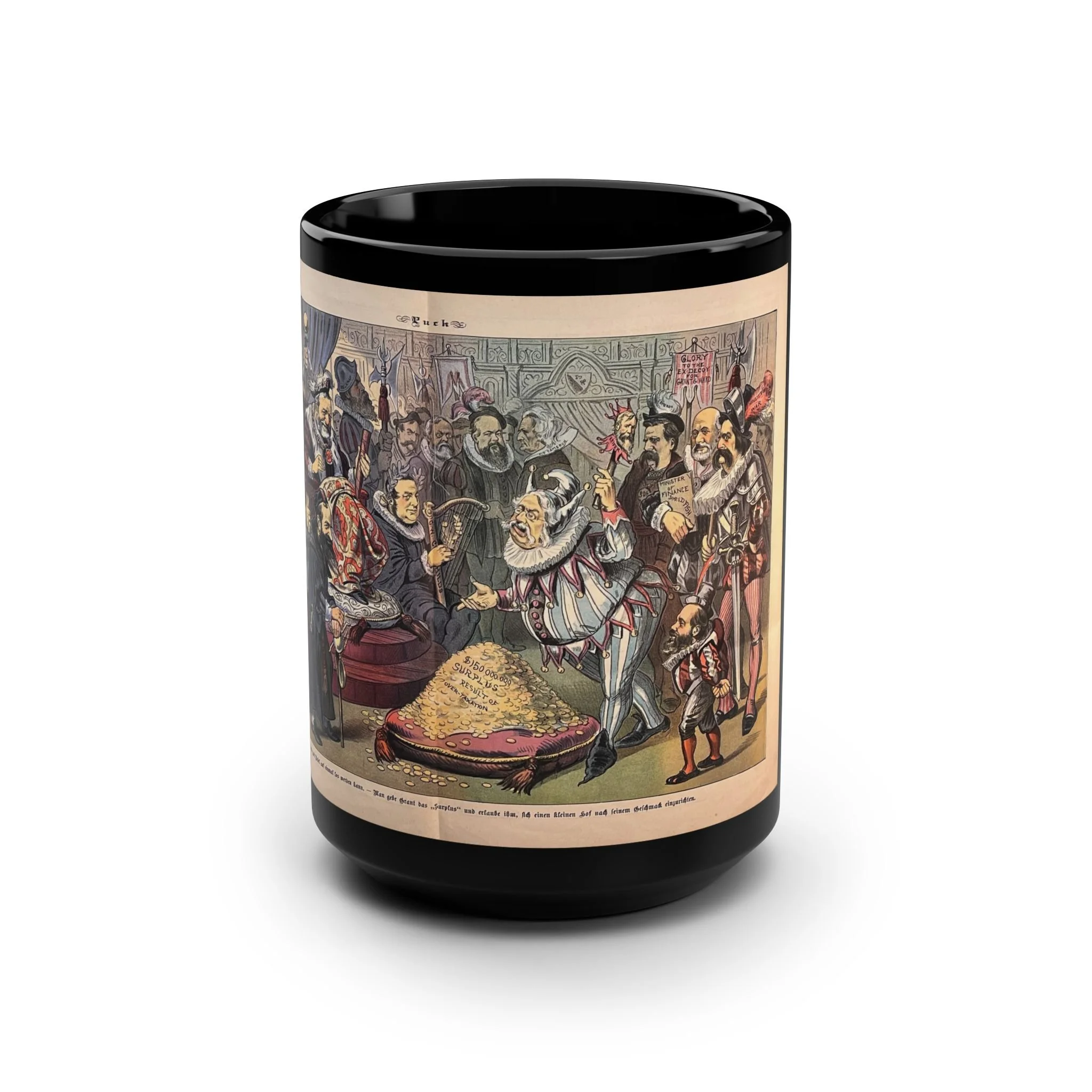 A razor-sharp 1884 Puck satire by Bernhard Gillam, showing politicians dressed as Renaissance courtiers fighting over a gigantic pile of “surplus” gold — the product of over-taxation and government mismanagement. Every figure is a type: the self-satisfied king, the grasping ministers, the scheming advisors, and the theatrical fools begging for their share of the public treasury. The cartoon unmasks a political class more eager to divide spoils than serve citizens. This print comes from a German-language edition of Puck, which kept all the original English captions in the artwork. The German text appears only in the cast list and bottom line — part of the historical publication and preserved here for authenticity. Originally published to expose elite corruption and mock the pageantry of power, it still resonates today.