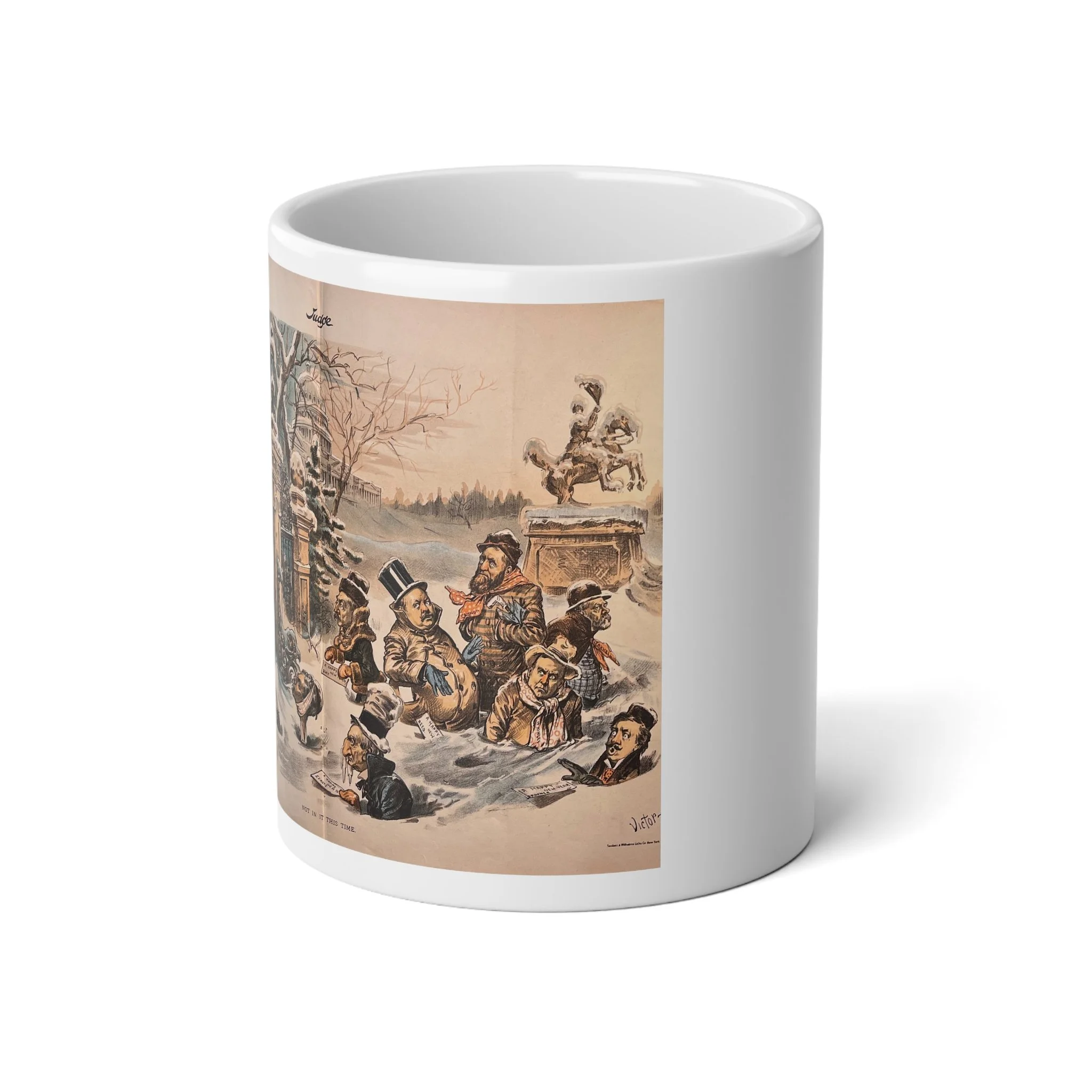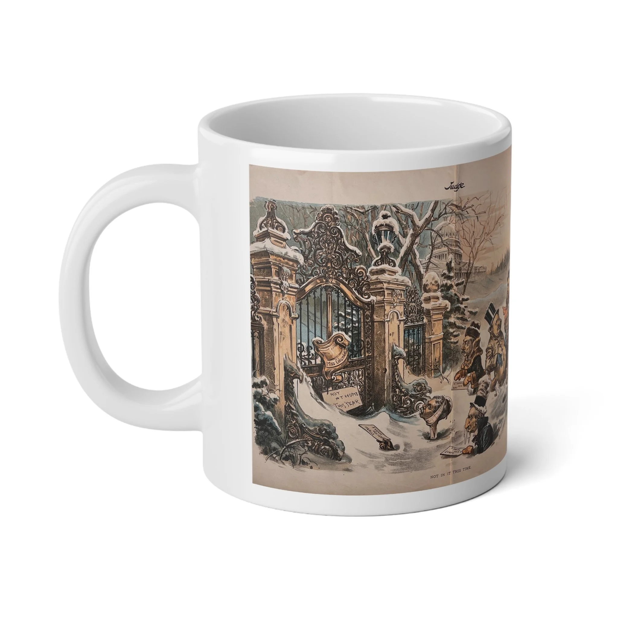 In this 1891 Judge cartoon, a parade of political insiders trudges through the snow toward the gates of “Miss Columbia,” only to find a sign that reads: “Not at home this year.” The message was sharp then and sharper now—when corruption, entitlement, and backroom influence start lining up for their usual privileges, a healthy democracy has every right to slam the gate shut. This artwork poked fun at the power brokers who thought the nation owed them access. Today, it reads like a reminder that the republic belongs to the people, not to the grifters, deal-makers, and would-be authoritarians who keep trying to sneak in through the side door.