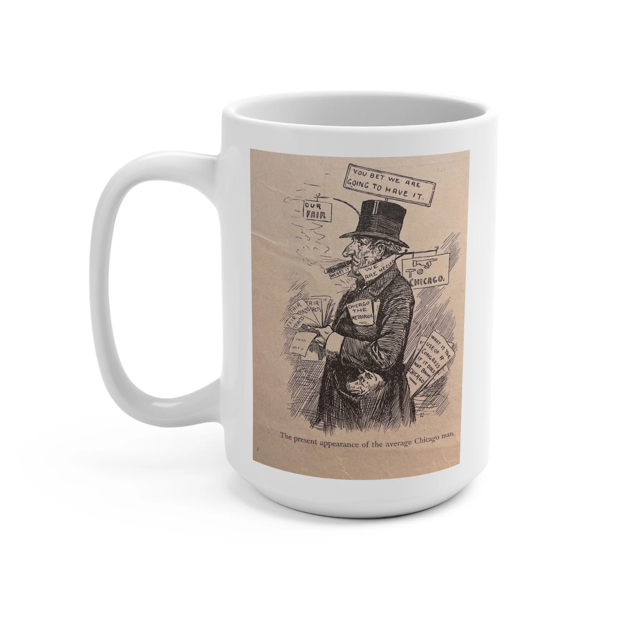 This 1891 Judge magazine cartoon pokes fun at Chicago’s over-the-top campaign to secure the World’s Fair. The “average Chicago man” is shown buried under booster slogans, puffed-up pride, and frantic political pressure—every pocket stuffed with propaganda, every sign insisting the city must win. It’s satire aimed at civic ego and the way power structures hype themselves into inevitability. More than a century later, the joke still lands.