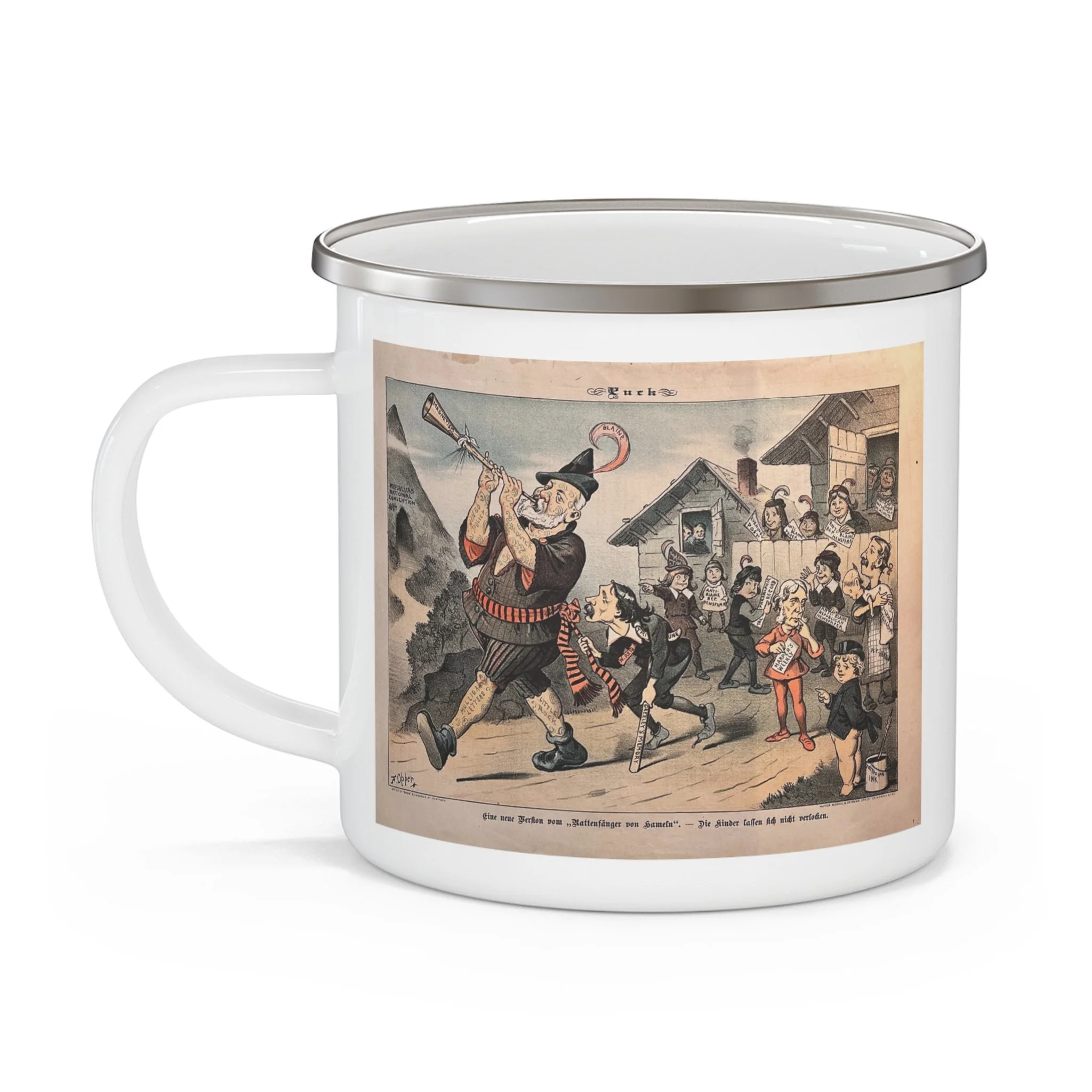 In this 1884 Puck cartoon, James G. Blaine appears as a crooked Pied Piper, puffing on a magical flute labeled “Magnetic Influence” while trying to lure newspaper editors into supporting his presidential ambitions. Each “child” carries a newspaper title—and each one refuses to follow. The message was unmistakable: a free press cannot be bought, charmed, or intimidated into obedience. This edition was printed for Puck’s German-speaking readership, which is why the caption beneath the image is in German—but the cartoon itself retains its original English labels and satire. Nothing has been altered; the artwork is presented exactly as it appeared in 1884. Puck published this during the Republican National Convention, warning that political demagogues thrive only when journalists stop asking hard questions.