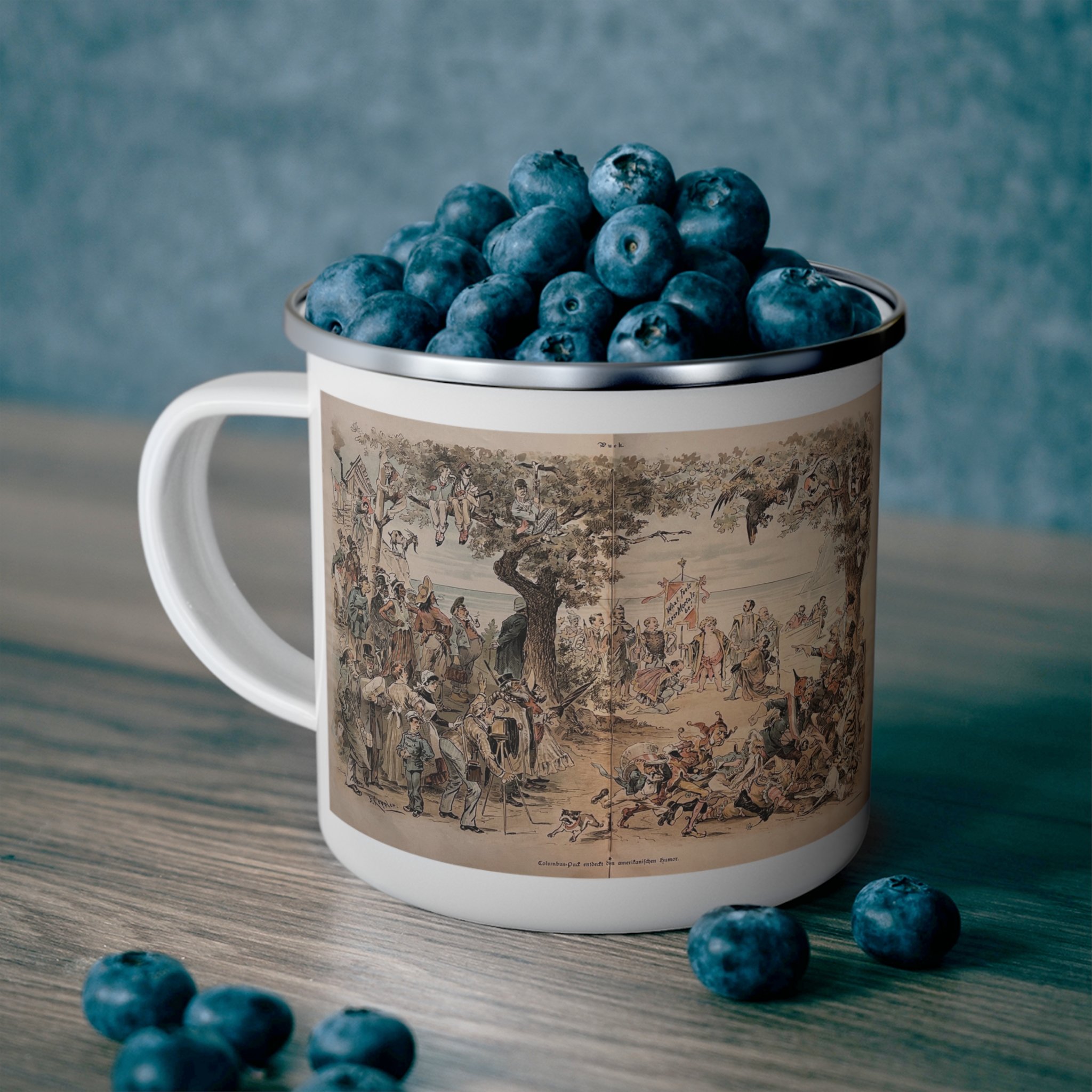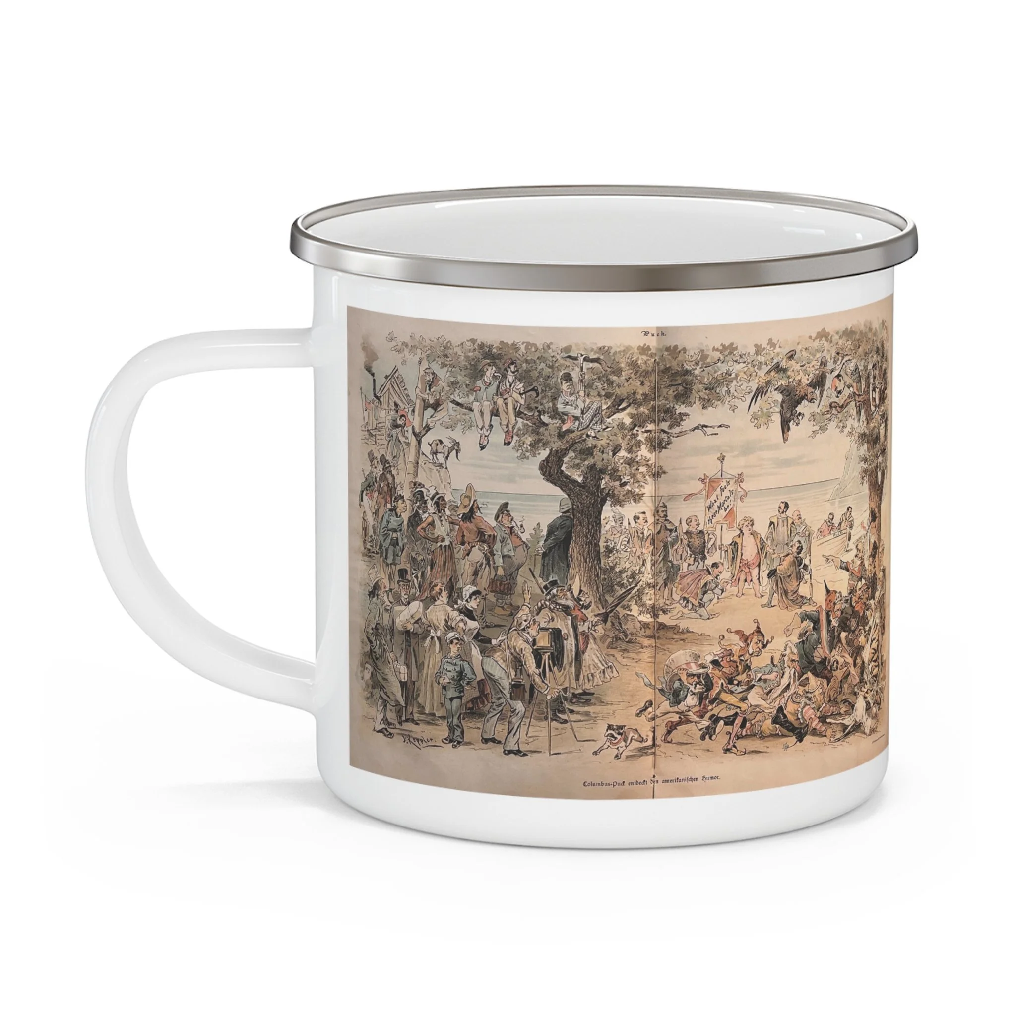In this 1890s Puck centerfold, “Columbus-Puck” arrives not to discover a continent, but to discover something far stranger — American political humor. The scene is packed with the era’s crooked politicians, frantic partisans, and theatrical public figures, all brawling, posing, and performing for attention while ordinary people stand bewildered at the edges. Printed in German for immigrant readers, the cartoon satirizes nationalism, political vanity, and the chaotic spectacle of American democracy in the Gilded Age. Over a century later, the imagery is hauntingly familiar: leaders obsessed with theatrics, crowds whipped into frenzy, and a culture that turns politics into a circus instead of a public good.