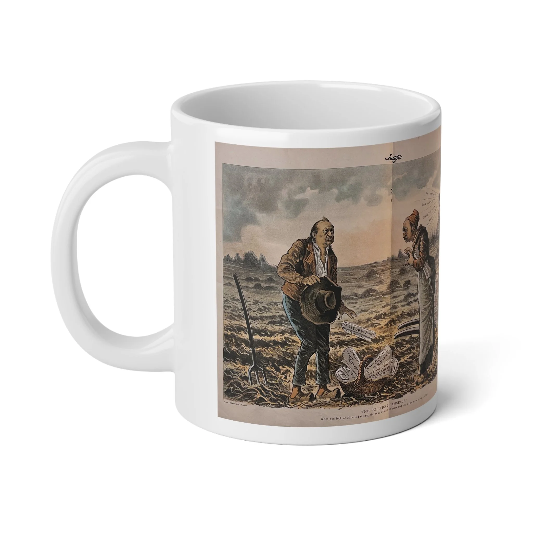 In 1890, Judge Magazine took aim at Chicago’s swaggering bid to host the World’s Fair. The artist imagines the city as an overconfident cowboy straining beneath a globe-sized promise, while Uncle Sam looks on with a familiar mix of annoyance and inevitability. It’s a classic American problem: leaders who chase spectacle, prestige, and headlines—and then expect the public to carry the weight when reality hits. This piece lands squarely in the tradition of resistance satire that exposes political vanity and the empty theatrics of power. Then as now, grand projects can become distractions from real governance, transparency, and accountability. A perfect choice for anyone who enjoys watching hubris get the skewering it deserves.