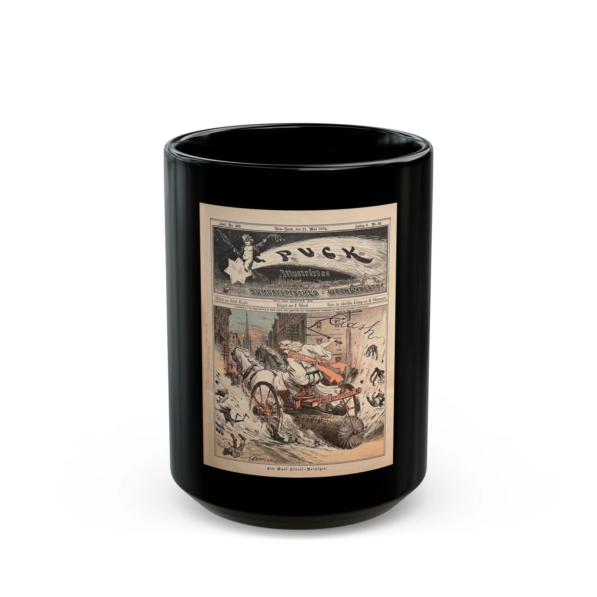 This image appeared in an 1884 issue of Puck magazine and was illustrated by Joseph Keppler. It depicts a “Wall Street cleaner” sweeping gamblers, stock-jobbers, and speculative schemes through the financial district, reflecting contemporary criticism of unchecked speculation and market fraud during the Gilded Age.