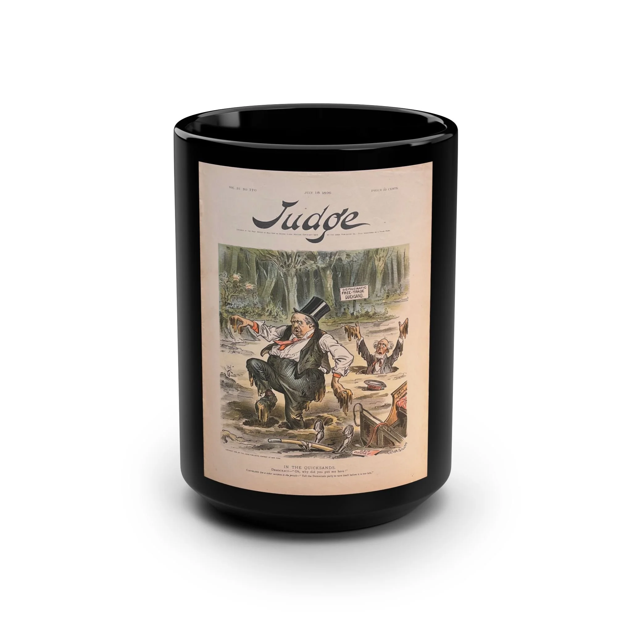 This cartoon appeared in an 1896 issue of Judge. Illustrated by Victor Gillam, it critiques President Grover Cleveland and the Democratic Party’s free-trade platform during the turbulent 1896 election debates over tariffs and economic policy.